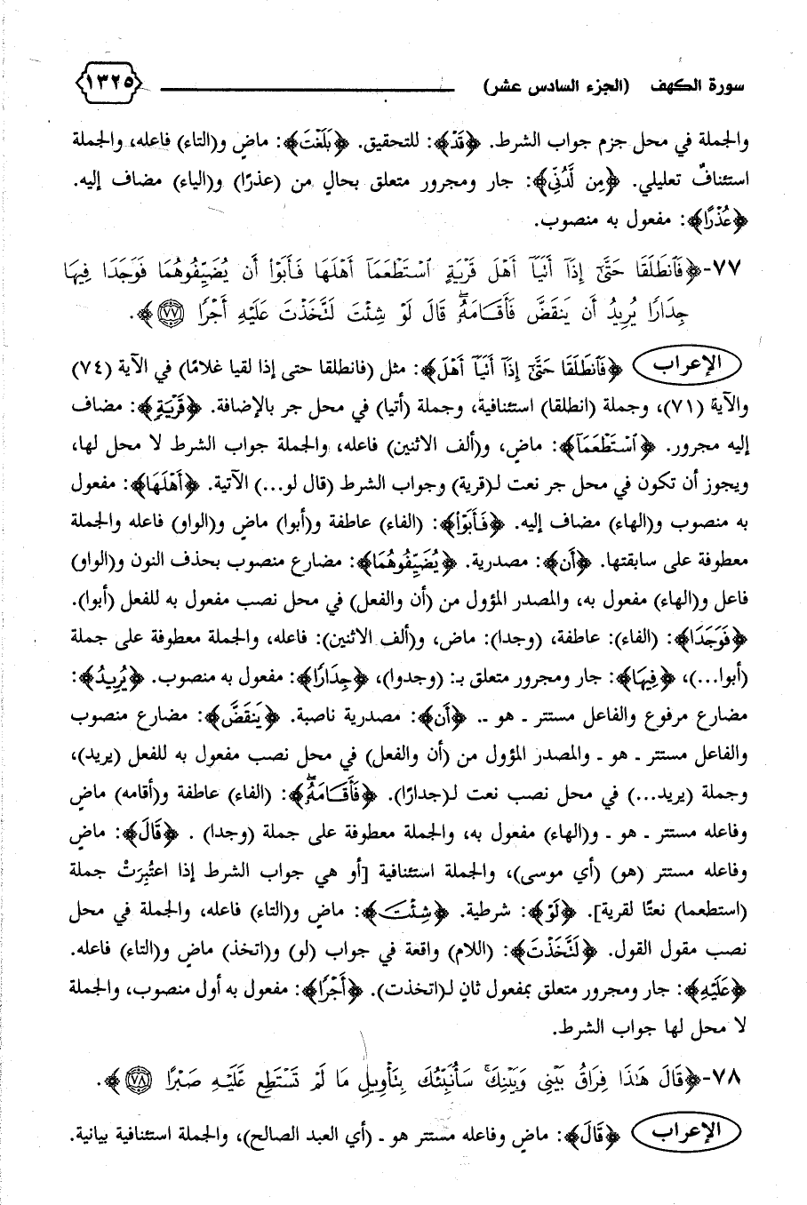 مضارع مرفوع والفاعل مستتر-هو-. {أَنْ}: مصدرية ناصبة. {يَنْقَضَّ}: مضارع منصوب والفاعل مستتر-هو-والمصدر المؤول من (أن والفعل) في محل نصب مفعول به للفعل (يريد)، وجملة (يريد ... ) في محل نصب نعت ل (جدارا). {فَأَقامَهُ}: (الفاء) عاطفة و (أقامه) ماض وفاعله مستتر-هو-و (الهاء) مفعول به، والجملة معطوفة على جملة (وجدا). {قالَ}: ماض وفاعله مستتر (هو) (أي موسى)، والجملة استئنافية [أو هي جواب الشرط إذا اعتبرت جملة (استطعما) نعتا لقرية]. {لَوْ}: شرطية. {شِئْتَ}: ماض و (التاء) فاعله، والجملة في محل نصب مقول القول. {لاتَّخَذْتَ}: (اللام) واقعة في جواب (لو) و (اتخذ) ماض و (التاء) فاعله.