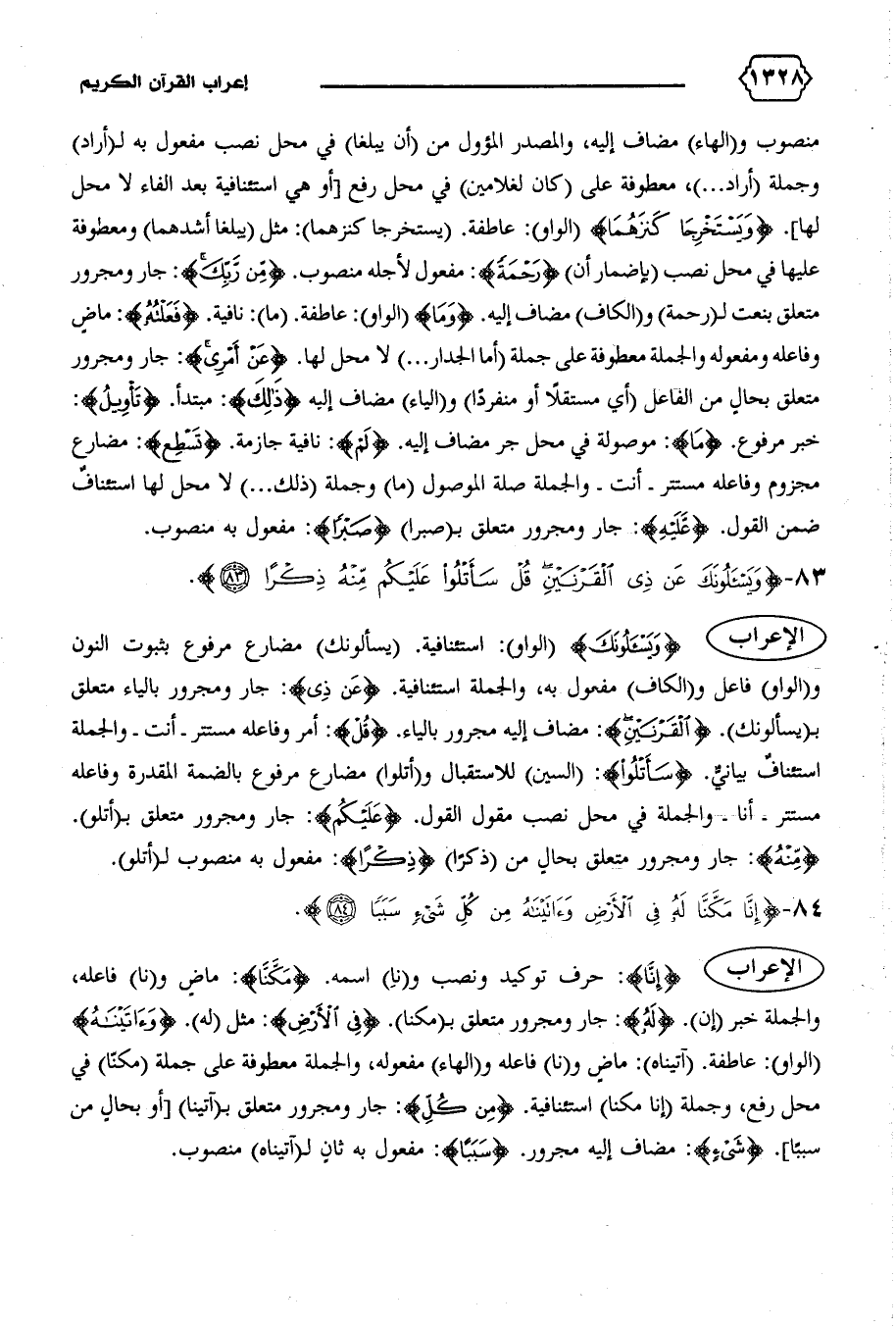 الإعراب {وَيَسْئَلُونَكَ} (الواو): استئنافية. (يسألونك) مضارع مرفوع بثبوت النون و (الواو) فاعل و (الكاف) مفعول به، والجملة استئنافية. {عَنْ ذِي}: جار ومجرور بالياء متعلق ب (يسألونك). {الْقَرْنَيْنِ}: مضاف إليه مجرور بالياء. {قُلْ}: أمر وفاعله مستتر-أنت-والجملة استئناف بيانيّ. {سَأَتْلُوا}: (السين) للاستقبال و (أتلو) مضارع مرفوع بالضمة المقدرة وفاعله مستتر-أنا-والجملة في محل نصب مقول القول. {عَلَيْكُمْ}: جار ومجرور متعلق ب (أتلو).