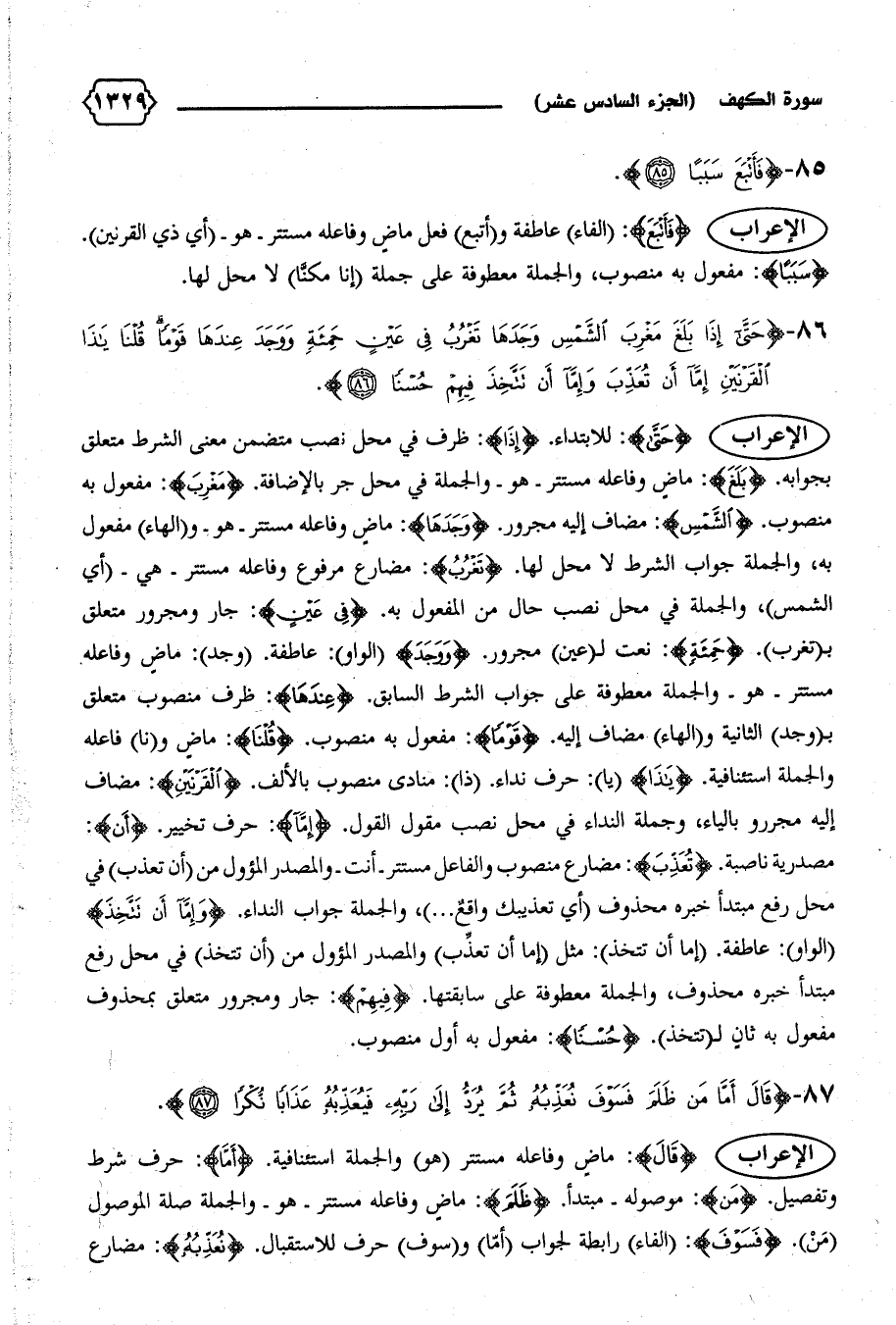 الإعراب {حَتّى}: للابتداء. {إِذا}: ظرف في محل نصب متضمن معنى الشرط متعلق بجوابه. {بَلَغَ}: ماض وفاعله مستتر-هو-والجملة في محل جر بالإضافة. {مَغْرِبَ}: مفعول به منصوب. {الشَّمْسِ}: مضاف إليه مجرور. {وَجَدَها}: ماض وفاعله مستتر-هو-و (الهاء) مفعول به، والجملة جواب الشرط لا محل لها. {تَغْرُبُ}: مضارع مرفوع وفاعله مستتر-هي- (أي الشمس)، والجملة في محل نصب حال من المفعول به. {فِي عَيْنٍ}: جار ومجرور متعلق ب (تغرب). {حَمِئَةٍ}: نعت ل (عين) مجرور. {وَوَجَدَ} (الواو): عاطفة. (وجد): ماض وفاعله مستتر-هو-والجملة معطوفة على جواب الشرط السابق. {عِنْدَها}: ظرف منصوب متعلق ب (وجد) الثانية و (الهاء) مضاف إليه. {قَوْماً}: مفعول به منصوب. {قُلْنا}: ماض و (نا) فاعله والجملة استئنافية. {يا ذَا} (يا): حرف نداء. (ذا): منادى منصوب بالألف. {الْقَرْنَيْنِ}: مضاف إليه مجرور بالياء، وجملة النداء في محل نصب مقول القول. {إِمّا}: حرف تخيير. {أَنْ}::