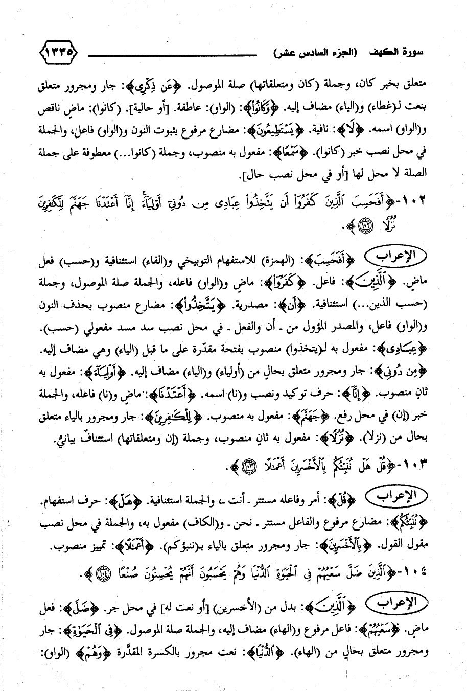 الإعراب {الَّذِينَ}: بدل من (الأخسرين) [أو نعت له] في محل جر. {ضَلَّ}: فعل ماض. {سَعْيُهُمْ}: فاعل مرفوع و (الهاء) مضاف إليه، والجملة صلة الموصول. {فِي الْحَياةِ}: جار ومجرور متعلق بحال من (الهاء). {الدُّنْيا}: نعت مجرور بالكسرة المقدّرة {وَهُمْ} (الواو):