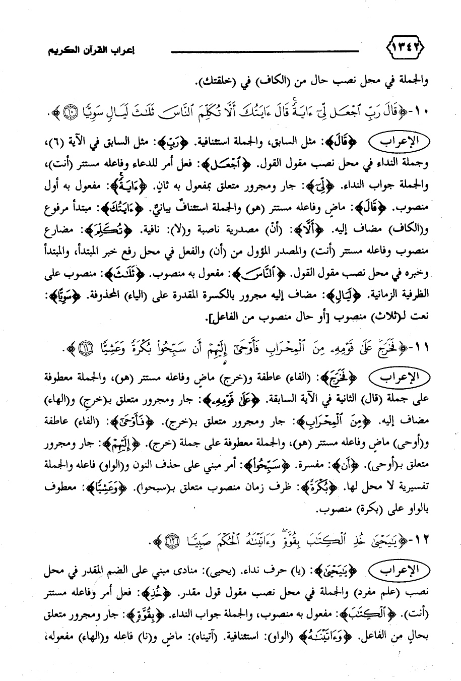الإعراب {يا يَحْيى}: (يا) حرف نداء. (يحيى): منادى مبني على الضم المقدر في محل نصب (علم مفرد) والجملة في محل نصب مقول قول مقدر. {خُذِ}: فعل أمر وفاعله مستتر (أنت). {الْكِتابَ}: مفعول به منصوب، والجملة جواب النداء. {بِقُوَّةٍ}: جار ومجرور متعلق بحال من الفاعل. {وَآتَيْناهُ} (الواو): استئنافية. (آتيناه): ماض و (نا) فاعله و (الهاء) مفعوله،