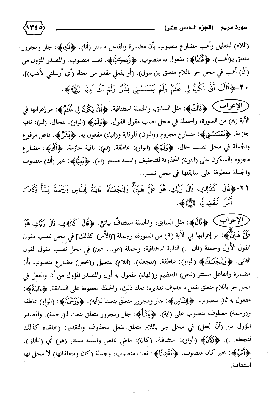 الإعراب {قالَ}: مثل السابق، والجملة استئناف بيانيّ. {قالَ كَذلِكِ قالَ رَبُّكِ هُوَ عَلَيَّ هَيِّنٌ}: مر إعرابها في الآية (٩) من السورة، وجملة [(الأمر) كذلك] في محل نصب مقول القول الأول وجملة (قال ... ) الثانية استئنافية، وجملة (هو ... هين) في محل نصب مقول القول الثاني. {وَلِنَجْعَلَهُ} (الواو): عاطفة. (لنجعله): (اللام) للتعليل و (نجعل) مضارع منصوب بأن مضمرة والفاعل مستتر (نحن) للتعظيم و (الهاء) مفعول به أول والمصدر المؤول من أن والفعل في محل جر باللام متعلق بفعل محذوف تقديره: فعلنا ذلك، والجملة معطوفة على السابقة. {آيَةً}: