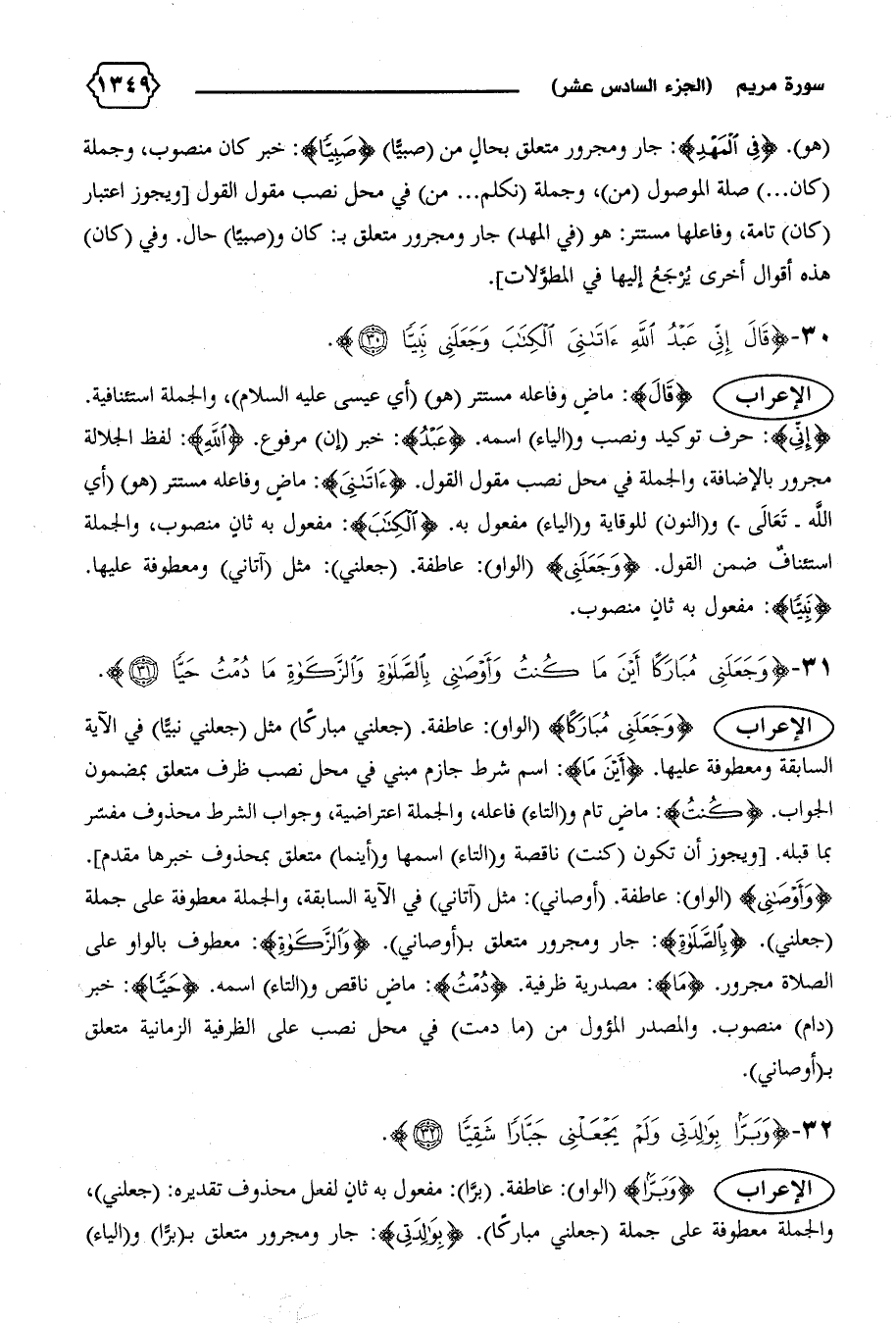 {إِنِّي}: حرف توكيد ونصب و (الياء) اسمه. {عَبْدُ}: خبر (إن) مرفوع. {اللهِ}: لفظ الجلالة مجرور بالإضافة، والجملة في محل نصب مقول القول. {آتانِيَ}: ماض وفاعله مستتر (هو) (أي الله-تعالى-) و (النون) للوقاية و (الياء) مفعول به. {الْكِتابَ}: مفعول به ثان منصوب، والجملة استئناف ضمن القول. {وَجَعَلَنِي} (الواو): عاطفة. (جعلني): مثل (آتاني) ومعطوفة عليها.