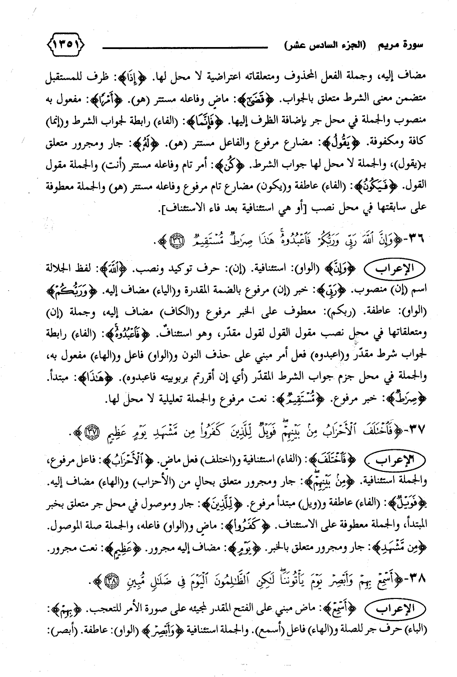 الإعراب {وَإِنَّ} (الواو): استئنافية. (إن): حرف توكيد ونصب. {اللهَ}: لفظ الجلالة اسم (إن) منصوب. {رَبِّي}: خبر (إن) مرفوع بالضمة المقدرة و (الياء) مضاف إليه. {وَرَبُّكُمْ} (الواو): عاطفة. (ربكم): معطوف على الخبر مرفوع و (الكاف) مضاف إليه، وجملة (إن) ومتعلقاتها في محل نصب مقول القول لقول مقدّر، وهو استئناف. {فَاعْبُدُوهُ}: (الفاء) رابطة لجواب شرط مقدّر و (اعبدوه) فعل أمر مبني على حذف النون و (الواو) فاعل و (الهاء) مفعول به، والجملة في محل جزم جواب الشرط المقدّر (أي إن أقررتم بربوبيته فاعبدوه). {هذا}: مبتدأ.