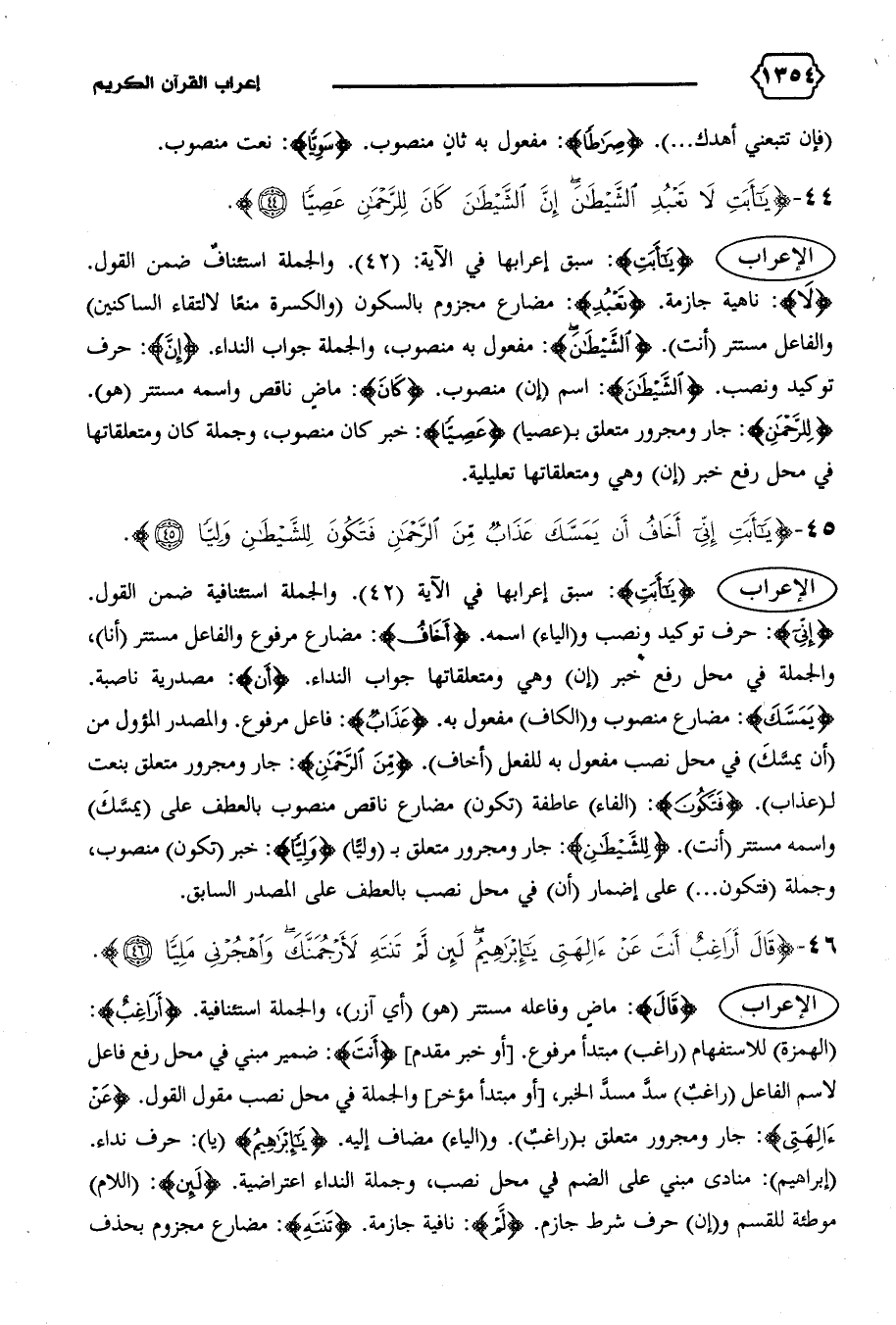 {لا}: ناهية جازمة. {تَعْبُدِ}: مضارع مجزوم بالسكون (والكسرة منعا لالتقاء الساكنين) والفاعل مستتر (أنت). {الشَّيْطانَ}: مفعول به منصوب، والجملة جواب النداء. {إِنَّ}: حرف توكيد ونصب. {الشَّيْطانَ}: اسم (إن) منصوب. {كانَ}: ماض ناقص واسمه مستتر (هو).