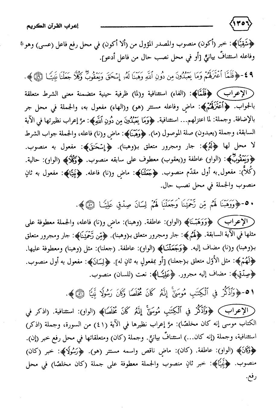 الإعراب {فَلَمَّا}: (الفاء) استئنافية و (لما) ظرفية حينية متضمنة معنى الشرط متعلقة بالجواب. {اِعْتَزَلَهُمْ}: ماض وفاعله مستتر (هو) و (الهاء) مفعول به، والجملة في محل جر بالإضافة. وجملة: لما اعتزلهم ... استئنافية. {وَما يَعْبُدُونَ مِنْ دُونِ اللهِ}: مرّ إعراب نظيرتها في الآية السابقة، وجملة (يعبدون) صلة الموصول (ما). {وَهَبْنا}: ماض و (نا) فاعله، والجملة جواب الشرط لا محل لها {لَهُ}: جار ومجرور متعلق ب (وهبنا). {إِسْحاقَ}: مفعول به منصوب.