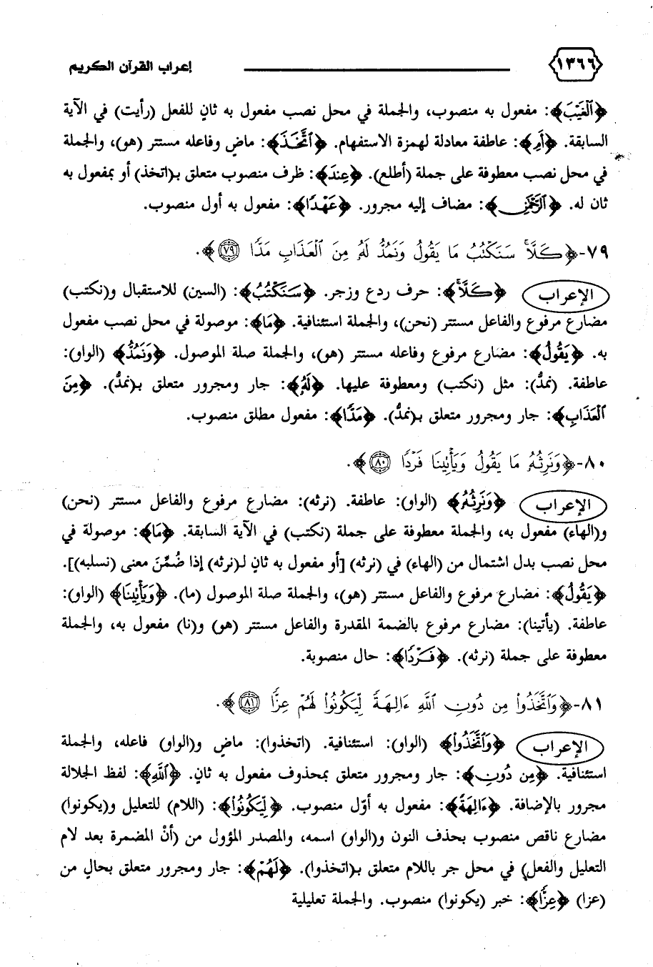 الإعراب {كَلاّ}: حرف ردع وزجر. {سَنَكْتُبُ}: (السين) للاستقبال و (نكتب) مضارع مرفوع والفاعل مستتر (نحن)، والجملة استئنافية. {ما}: موصولة في محل نصب مفعول به. {يَقُولُ}: مضارع مرفوع وفاعله مستتر (هو)، والجملة صلة الموصول. {وَنَمُدُّ} (الواو):