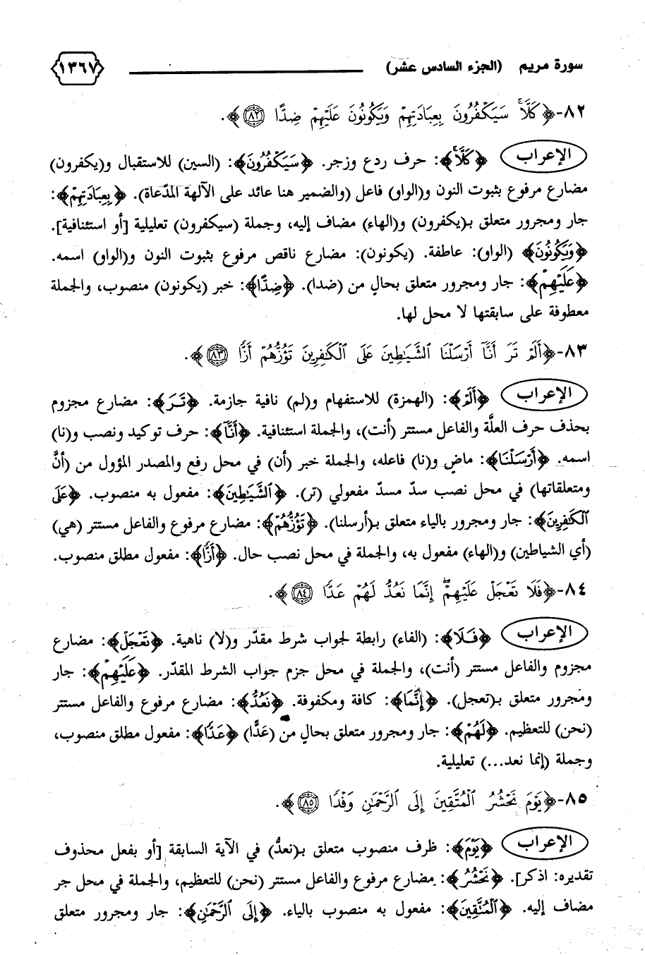 الإعراب {أَلَمْ}: (الهمزة) للاستفهام و (لم) نافية جازمة. {تَرَ}: مضارع مجزوم بحذف حرف العلّة والفاعل مستتر (أنت)، والجملة استئنافية. {أَنّا}: حرف توكيد ونصب و (نا) اسمه. {أَرْسَلْنَا}: ماض و (نا) فاعله، والجملة خبر (أن) في محل رفع والمصدر المؤول من (أنّ ومتعلقاتها) في محل نصب سدّ مسدّ مفعولي (تر). {الشَّياطِينَ}: مفعول به منصوب. {عَلَى الْكافِرِينَ}: جار ومجرور بالياء متعلق ب (أرسلنا). {تَؤُزُّهُمْ}: مضارع مرفوع والفاعل مستتر (هي) (أي الشياطين) و (الهاء) مفعول به، والجملة في محل نصب حال. {أَزًّا}: مفعول مطلق منصوب.