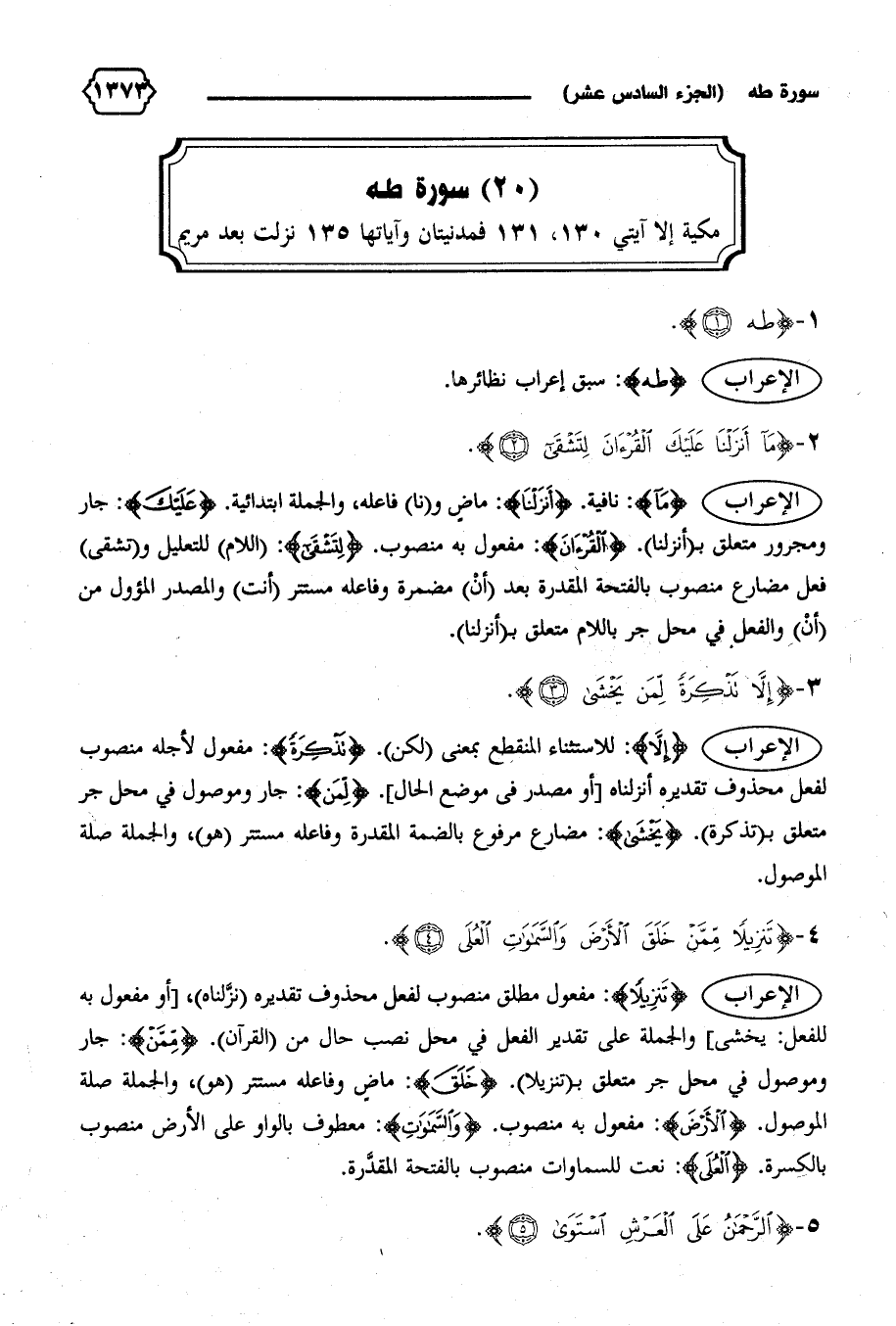 الإعراب {تَنْزِيلاً}: مفعول مطلق منصوب لفعل محذوف تقديره (نزّلناه)، [أو مفعول به للفعل: يخشى] والجملة على تقدير الفعل في محل نصب حال من (القرآن). {مِمَّنْ}: جار وموصول في محل جر متعلق ب (تنزيلا). {خَلَقَ}: ماض وفاعله مستتر (هو)، والجملة صلة الموصول. {الْأَرْضَ}: مفعول به منصوب. {وَالسَّماواتِ}: معطوف بالواو على الأرض منصوب بالكسرة. {الْعُلى}: نعت للسماوات منصوب بالفتحة المقدّرة.