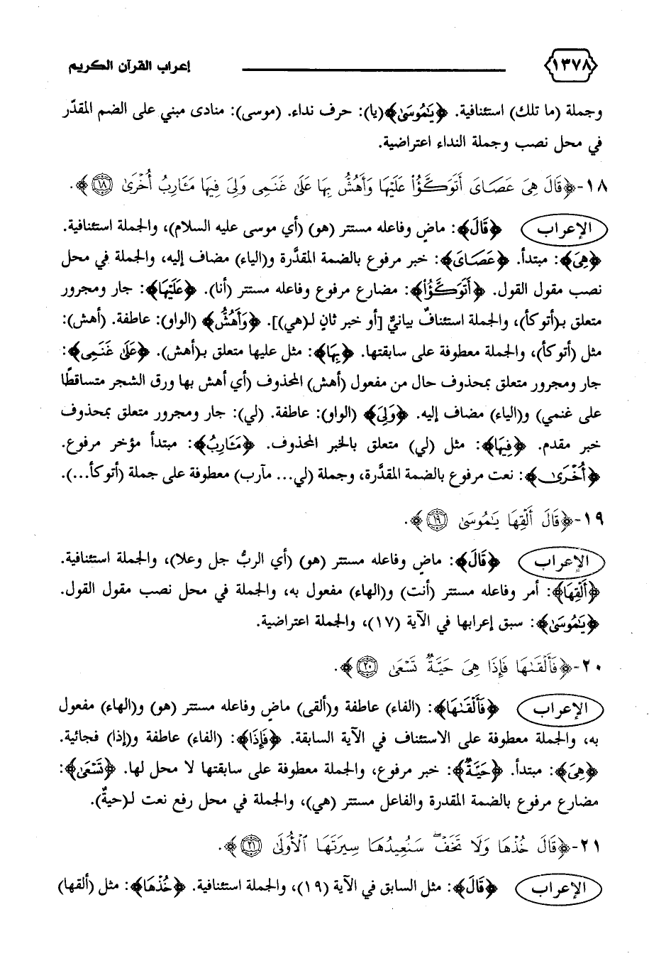 وجملة (ما تلك) استئنافية. {يا مُوسى} (يا): حرف نداء. (موسى): منادى مبني على الضم المقدّر في محل نصب وجملة النداء اعتراضية.