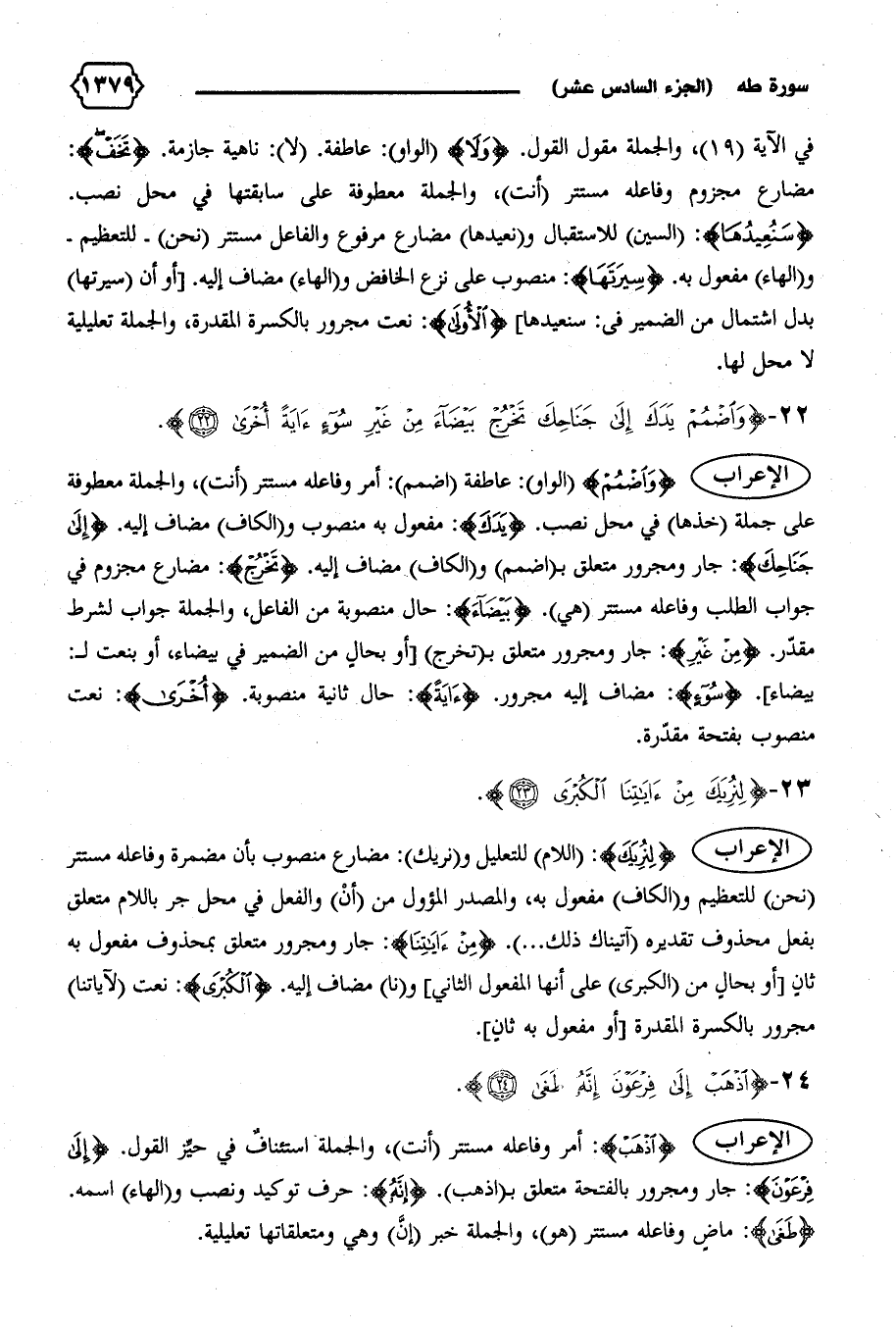 الإعراب {اِذْهَبْ}: أمر وفاعله مستتر (أنت)، والجملة استئناف في حيّز القول. {إِلى فِرْعَوْنَ}: جار ومجرور بالفتحة متعلق ب (اذهب). {إِنَّهُ}: حرف توكيد ونصب و (الهاء) اسمه.