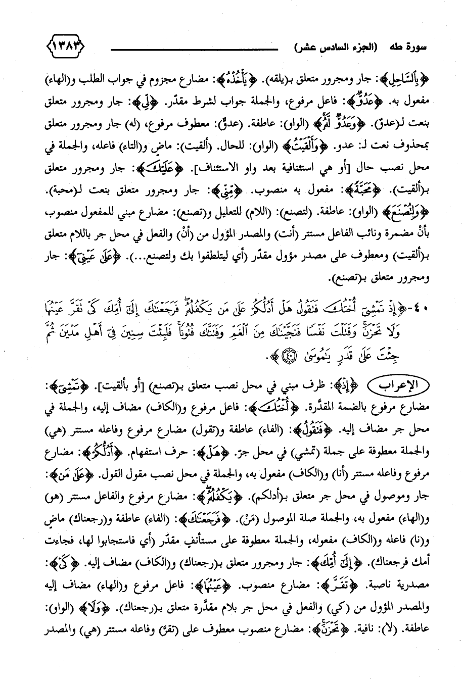 {بِالسّاحِلِ}: جار ومجرور متعلق ب (يلقه). {يَأْخُذْهُ}: مضارع مجزوم في جواب الطلب و (الهاء) مفعول به. {عَدُوٌّ}: فاعل مرفوع، والجملة جواب لشرط مقدّر. {لِي}: جار ومجرور متعلق بنعت ل (عدو). {وَعَدُوٌّ لَهُ} (الواو): عاطفة. (عدوّ): معطوف مرفوع، (له) جار ومجرور متعلق بمحذوف نعت ل: عدو. {وَأَلْقَيْتُ} (الواو): للحال. (ألقيت): ماض و (التاء) فاعله، والجملة في محل نصب حال [أو هي استئنافية بعد واو الاستئناف]. {عَلَيْكَ}: جار ومجرور متعلق ب (ألقيت). {مَحَبَّةً}: مفعول به منصوب. {مِنِّي}: جار ومجرور متعلق بنعت ل (محبة).