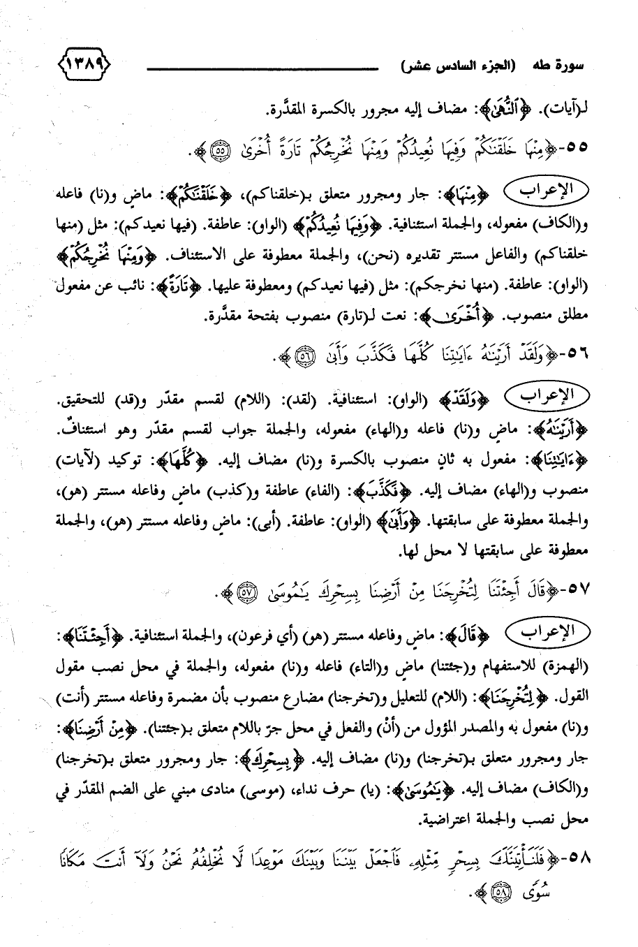 الإعراب {مِنْها}: جار ومجرور متعلق ب (خلقناكم)، {خَلَقْناكُمْ}: ماض و (نا) فاعله و (الكاف) مفعوله، والجملة استئنافية. {وَفِيها نُعِيدُكُمْ} (الواو): عاطفة. (فيها نعيدكم): مثل (منها خلقناكم) والفاعل مستتر تقديره (نحن)، والجملة معطوفة على الاستئناف. {وَمِنْها نُخْرِجُكُمْ} (الواو): عاطفة. (منها نخرجكم): مثل (فيها نعيدكم) ومعطوفة عليها. {تارَةً}: نائب عن مفعول مطلق منصوب. {أُخْرى}: نعت ل (تارة) منصوب بفتحة مقدّرة.