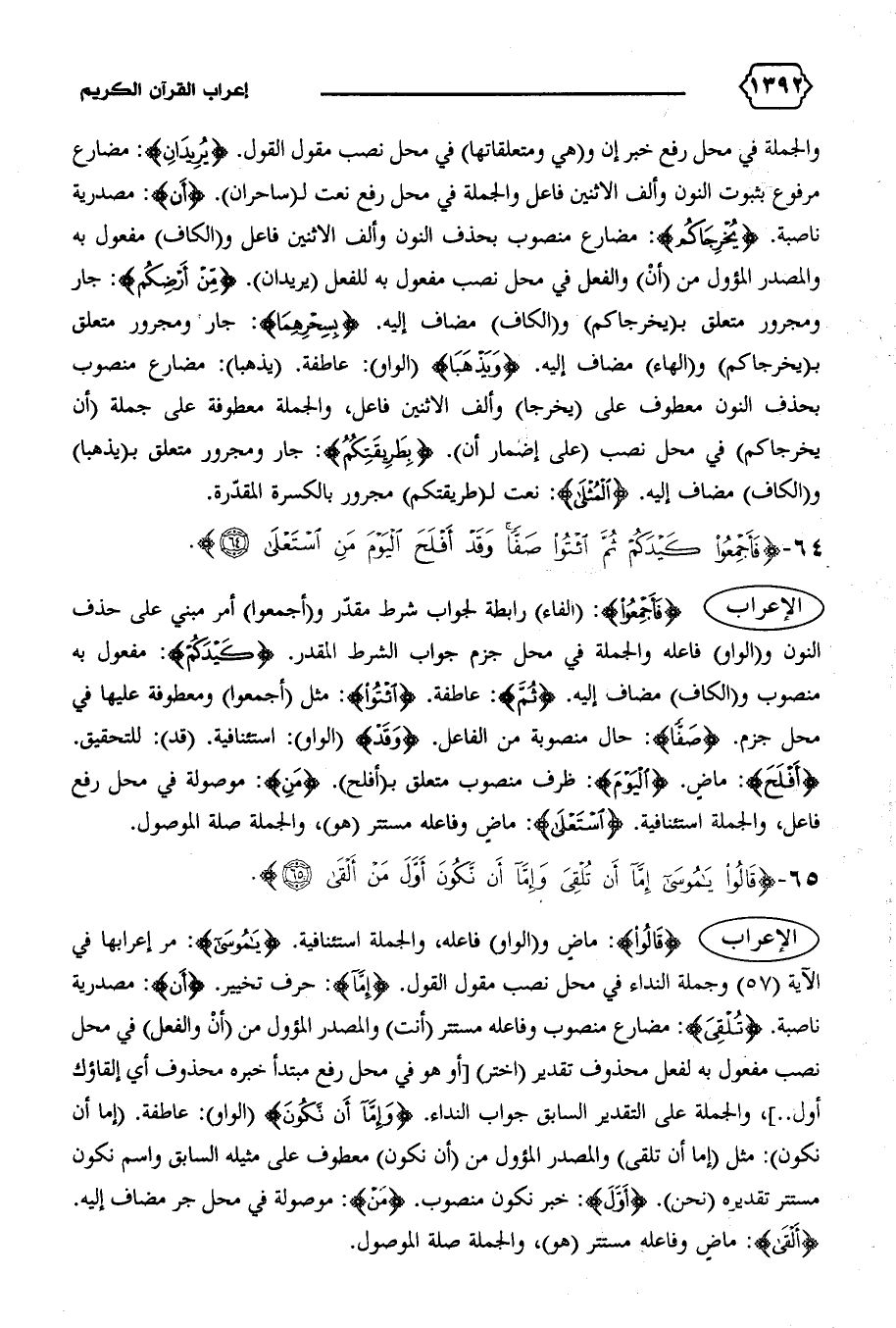 والجملة في محل رفع خبر إن و (هي ومتعلقاتها) في محل نصب مقول القول. {يُرِيدانِ}: مضارع مرفوع بثبوت النون وألف الاثنين فاعل والجملة في محل رفع نعت ل (ساحران). {إِنْ}: مصدرية ناصبة. {يُخْرِجاكُمْ}: مضارع منصوب بحذف النون وألف الاثنين فاعل و (الكاف) مفعول به والمصدر المؤول من (أن) والفعل في محل نصب مفعول به للفعل (يريدان). {مِنْ أَرْضِكُمْ}: جار ومجرور متعلق ب (يخرجاكم) و (الكاف) مضاف إليه. {بِسِحْرِهِما}: جار ومجرور متعلق ب (يخرجاكم) و (الهاء) مضاف إليه. {وَيَذْهَبا} (الواو): عاطفة. (يذهبا): مضارع منصوب بحذف النون معطوف على (يخرجا) وألف الاثنين فاعل، والجملة معطوفة على جملة (أن يخرجاكم) في محل نصب (على إضمار أن). {بِطَرِيقَتِكُمُ}: جار ومجرور متعلق ب (يذهبا) و (الكاف) مضاف إليه. {الْمُثْلى}: نعت ل (طريقتكم) مجرور بالكسرة المقدّرة.