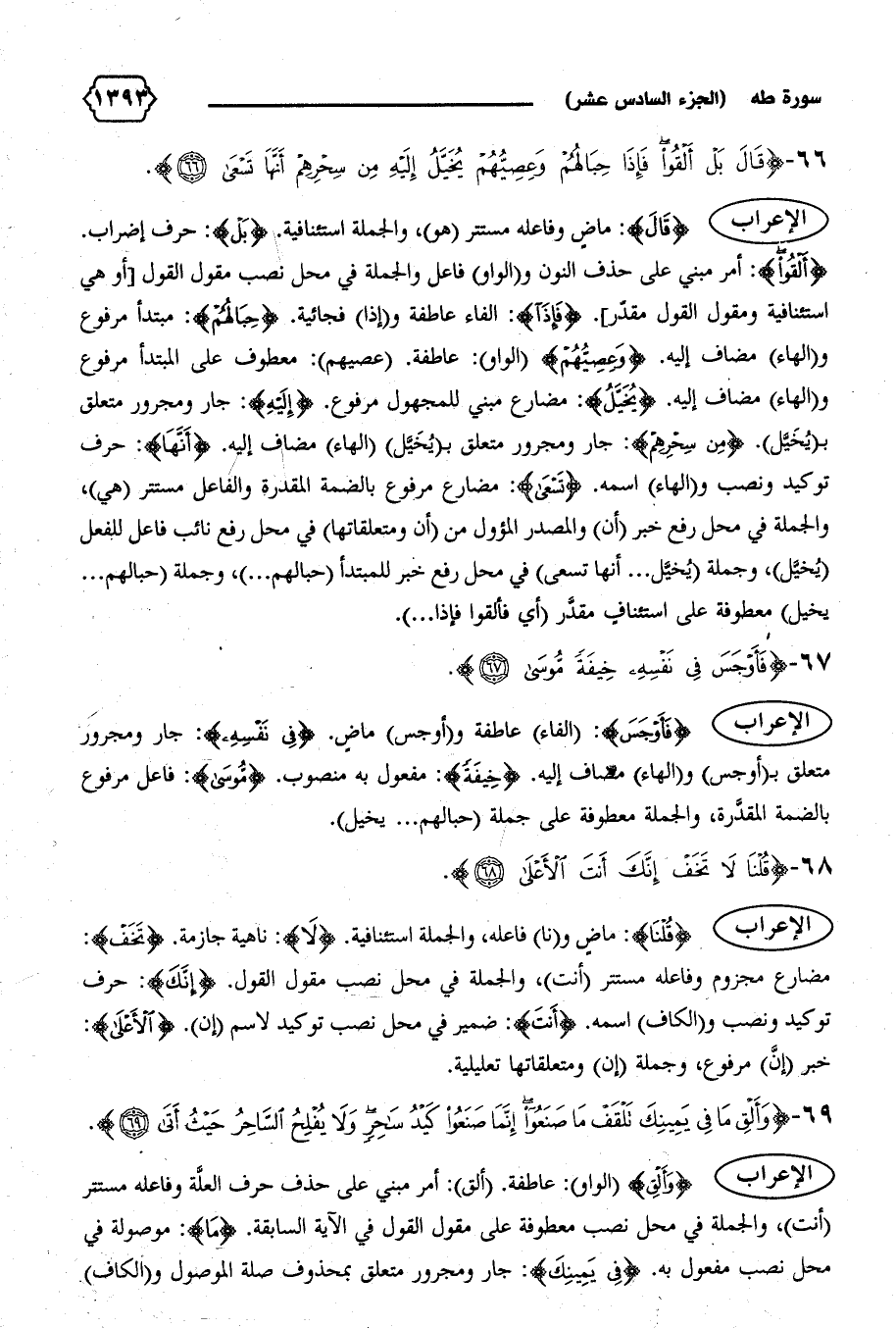 الإعراب {فَأَوْجَسَ}: (الفاء) عاطفة و (أوجس) ماض. {فِي نَفْسِهِ}: جار ومجرور متعلق ب (أوجس) و (الهاء) مضاف إليه. {خِيفَةً}: مفعول به منصوب. {مُوسى}: فاعل مرفوع بالضمة المقدّرة، والجملة معطوفة على جملة (حبالهم ... يخيل).