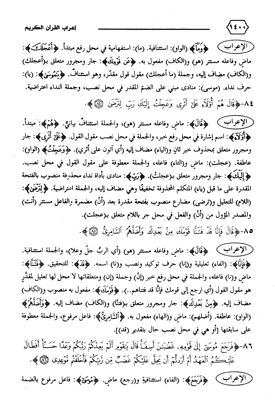 ماض و (نا) فاعله، والجملة في محل رفع خبر (إنّ) وجملة (إن) ومتعلقاتها لا محل لها تعليل لمقدّر هو مقول القول (أي ارجع إلى قومك فإنّا قد فتناهم .. ). {قَوْمَكَ}: مفعول به منصوب و (الكاف) مضاف إليه. {مِنْ بَعْدِكَ}: جار ومجرور متعلق ب (فتنّا) و (الكاف) مضاف إليه. {وَأَضَلَّهُمُ} (الواو): عاطفة. (أضلهم): ماض و (الهاء) مفعول به. {السّامِرِيُّ}: فاعل مرفوع، والجملة معطوفة على سابقتها [أو هي في محل نصب حال بتقدير (قد)].