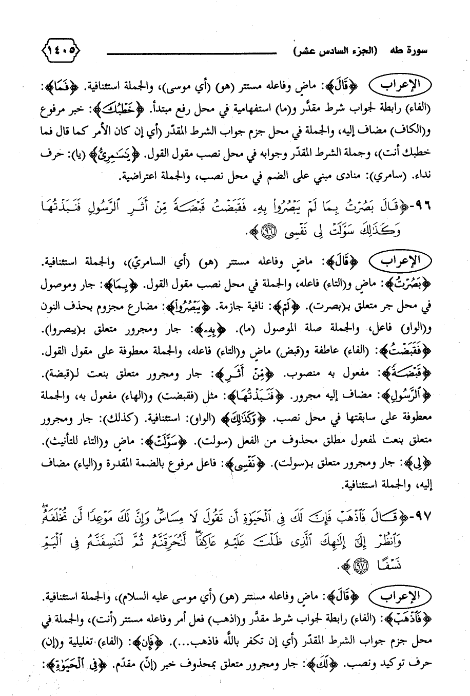 (الفاء) رابطة لجواب شرط مقدّر و (ما) استفهامية في محل رفع مبتدأ. {خَطْبُكَ}: خبر مرفوع و (الكاف) مضاف إليه، والجملة في محل جزم جواب الشرط المقدّر (أي إن كان الأمر كما قال فما خطبك أنت)، وجملة الشرط المقدّر وجوابه في محل نصب مقول القول. {يا سامِرِيُّ} (يا): حرف نداء. (سامري): منادى مبني على الضم في محل نصب، والجملة اعتراضية.
