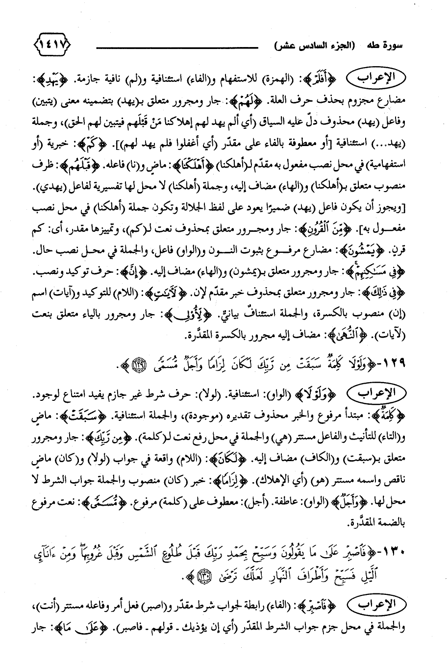 {كَلِمَةٌ}: مبتدأ مرفوع والخبر محذوف تقديره (موجودة)، والجملة استئنافية. {سَبَقَتْ}: ماض و (التاء) للتأنيث والفاعل مستتر (هي) والجملة في محل رفع نعت ل (كلمة). {مِنْ رَبِّكَ}: جار ومجرور متعلق ب (سبقت) و (الكاف) مضاف إليه. {لَكانَ}: (اللام) واقعة في جواب (لولا) و (كان) ماض ناقص واسمه مستتر (هو) (أي الإهلاك). {لِزاماً}: خبر (كان) منصوب والجملة جواب الشرط لا محل لها. {وَأَجَلٌ} (الواو): عاطفة. (أجل): معطوف على (كلمة) مرفوع. {مُسَمًّى}: نعت مرفوع بالضمة المقدّرة.