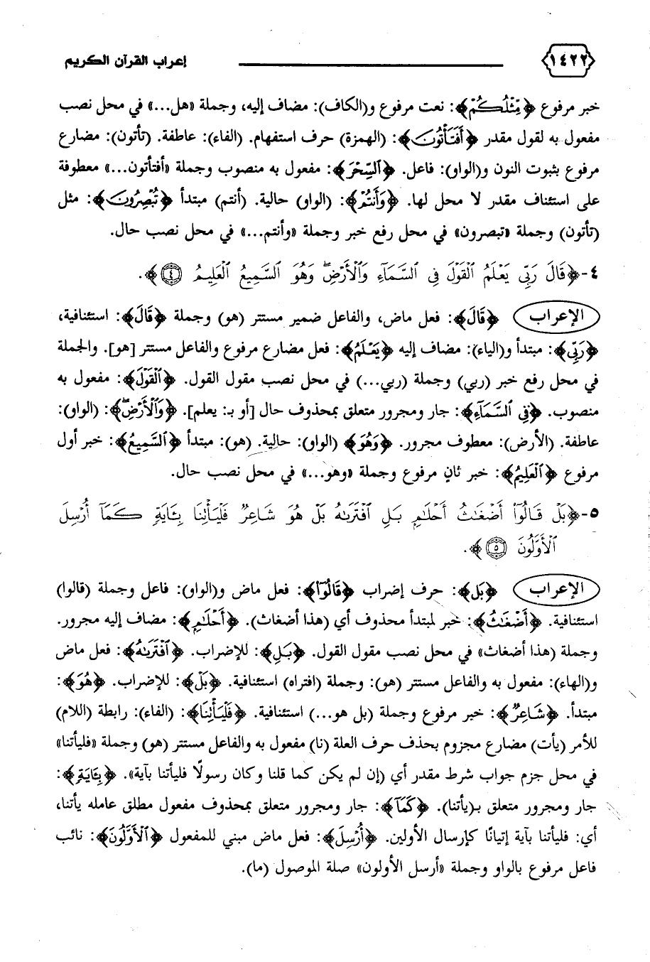 وجملة (هذا أضغاث» في محل نصب مقول القول. {بَلْ}: للإضراب. {اِفْتَراهُ}: فعل ماض و (الهاء): مفعول به والفاعل مستتر (هو): وجملة (افتراه) استئنافية. {بَلْ}: للإضراب. {هُوَ}: