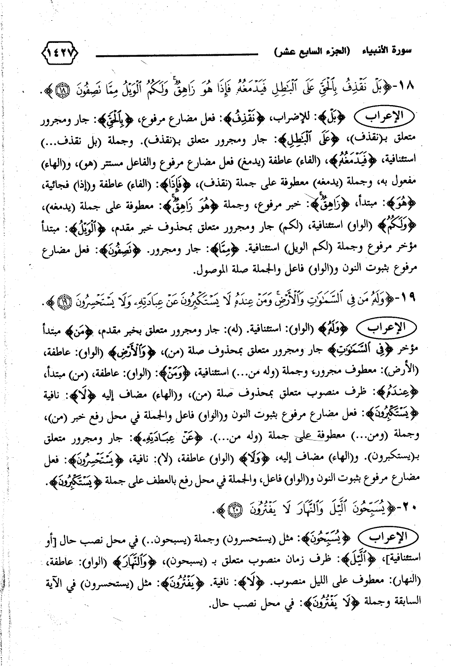 الإعراب {يُسَبِّحُونَ}: مثل (يستحسرون) وجملة (يسبحون .. ) في محل نصب حال [أو استئنافية]، {اللَّيْلَ}: ظرف زمان منصوب متعلق ب (يسبحون)، {وَالنَّهارَ} (الواو): عاطفة، (النهار): معطوف على الليل منصوب. {لا}: نافية. {يَفْتُرُونَ}: مثل (يستحسرون) في الآية السابقة وجملة {لا يَفْتُرُونَ}: في محل نصب حال.