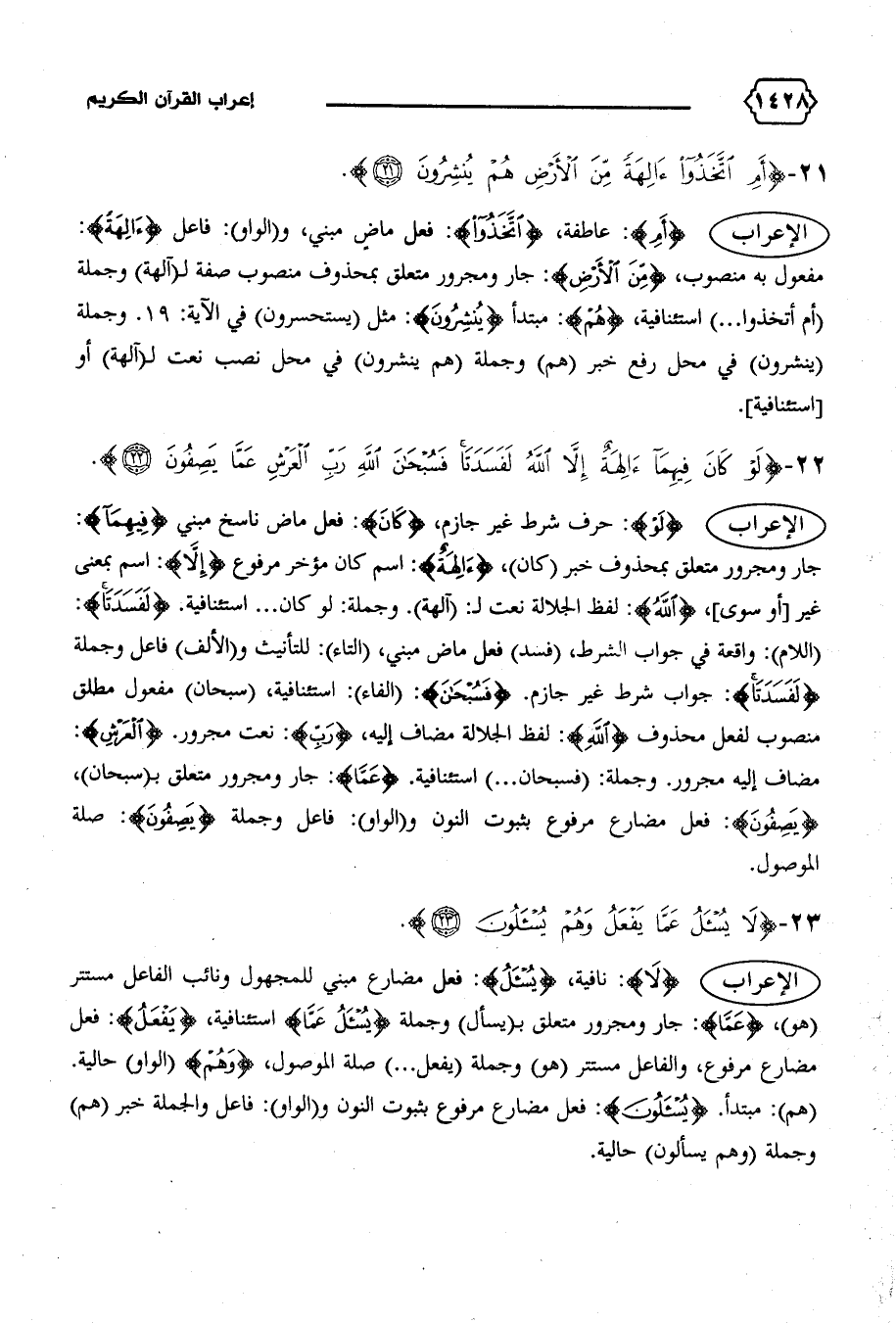 (اللام): واقعة في جواب الشرط، (فسد) فعل ماض مبني، (التاء): للتأنيث و (الألف) فاعل وجملة {لَفَسَدَتا}: جواب شرط غير جازم. {فَسُبْحانَ}: (الفاء): استئنافية، (سبحان) مفعول مطلق منصوب لفعل محذوف {اللهُ}: لفظ الجلالة مضاف إليه، {رَبِّ}: نعت مجرور. {الْعَرْشِ}: