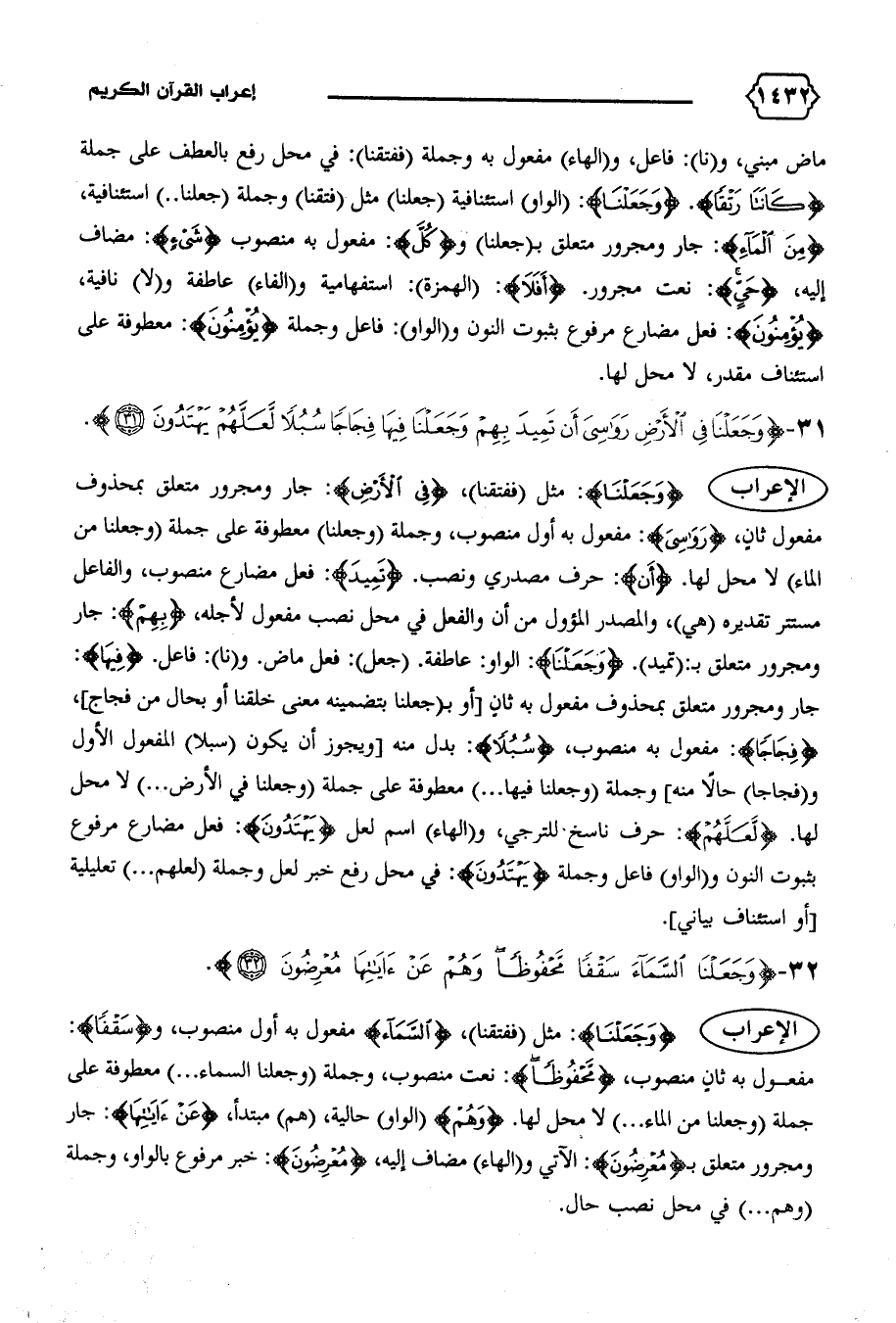 مفعول به ثان منصوب، {مَحْفُوظاً}: نعت منصوب، وجملة (وجعلنا السماء ... ) معطوفة على جملة (وجعلنا من الماء ... ) لا محل لها. {وَهُمْ} (الواو) حالية، (هم) مبتدأ، {عَنْ آياتِها}: جار ومجرور متعلق ب {مُعْرِضُونَ}: الآتي و (الهاء) مضاف إليه، {مُعْرِضُونَ}: خبر مرفوع بالواو، وجملة (وهم ... ) في محل نصب حال.