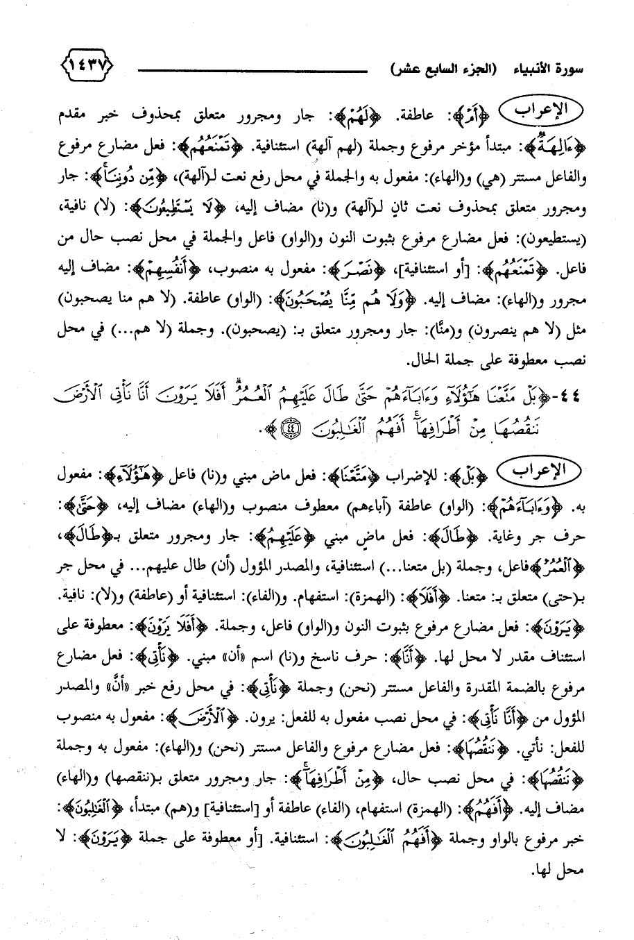 الإعراب {أَمْ}: عاطفة. {لَهُمْ}: جار ومجرور متعلق بمحذوف خبر مقدم {آلِهَةٌ}: مبتدأ مؤخر مرفوع وجملة (لهم آلهة) استئنافية. {تَمْنَعُهُمْ}: فعل مضارع مرفوع والفاعل مستتر (هي) و (الهاء): مفعول به والجملة في محل رفع نعت ل (آلهة)، {مِنْ دُونِنا}: جار ومجرور متعلق بمحذوف نعت ثان ل (آلهة) و (نا) مضاف إليه، {لا يَسْتَطِيعُونَ}: (لا) نافية، (يستطيعون): فعل مضارع مرفوع بثبوت النون و (الواو) فاعل والجملة في محل نصب حال من فاعل. {تَمْنَعُهُمْ}: [أو استئنافية]، {نَصْرَ}: مفعول به منصوب، {أَنْفُسِهِمْ}: مضاف إليه مجرور و (الهاء): مضاف إليه. {وَلا هُمْ مِنّا يُصْحَبُونَ}: (الواو) عاطفة. (لا هم منا يصحبون) مثل (لا هم ينصرون) و (منّا): جار ومجرور متعلق ب: (يصحبون).وجملة (لا هم ... ) في محل نصب معطوفة على جملة الحال.