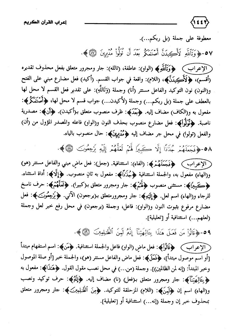الإعراب {وَتَاللهِ} (الواو): عاطفة، (تالله): جار ومجرور متعلق بفعل محذوف تقديره (أقسم)، {لَأَكِيدَنَّ،} (اللام): واقعة في جواب القسم. (أكيد) فعل مضارع مبني على الفتح و (النون) نون التوكيد والفاعل مستتر (أنا) وجملة (وتالله): على تقدير فعل القسم لا محل لها بالعطف على جملة (بل ربكم ... ) وجملة (لأكيدن ... ) جواب قسم لا محل لها، {أَصْنامَكُمْ}: