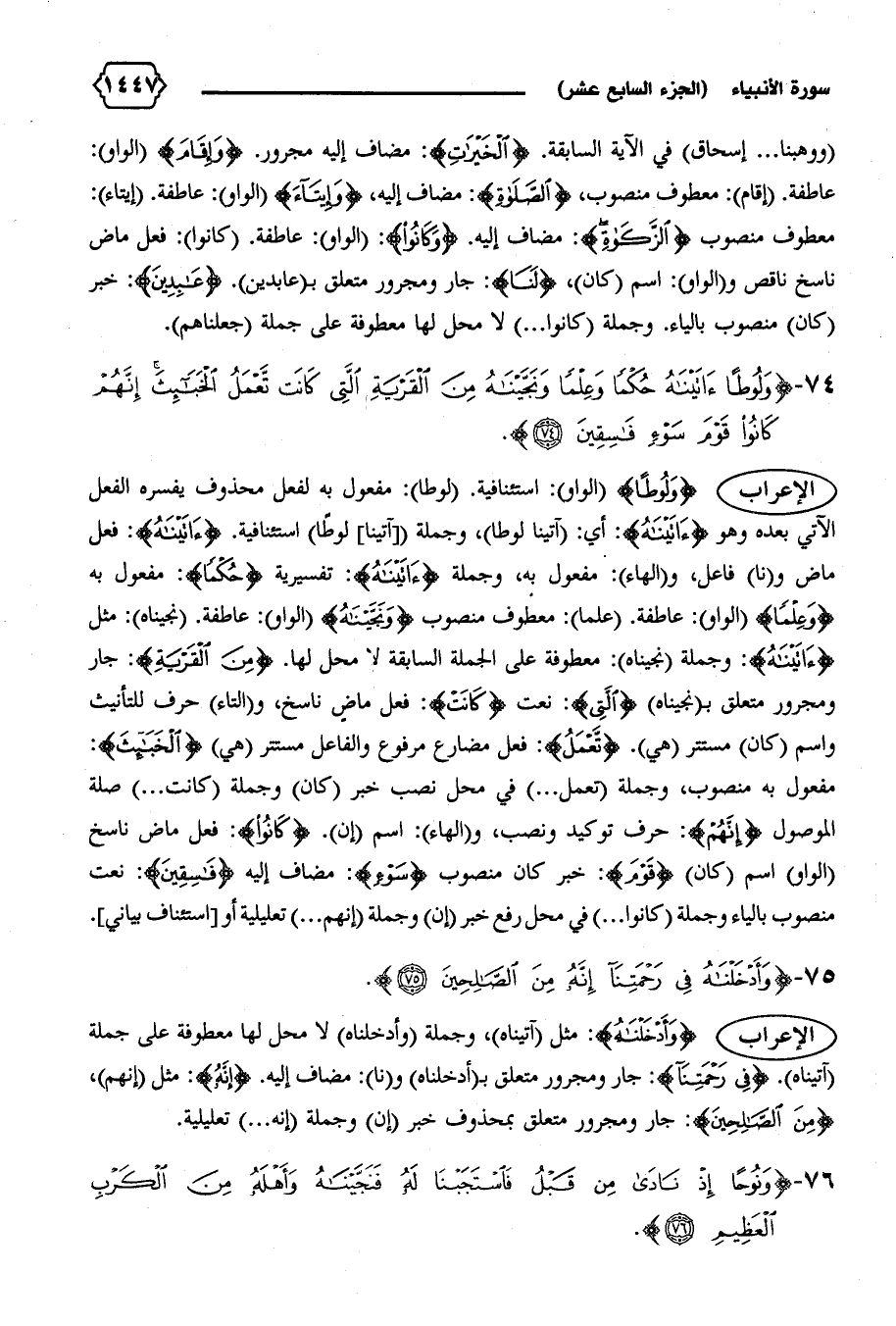 الإعراب {وَلُوطاً} (الواو): استئنافية. (لوطا): مفعول به لفعل محذوف يفسره الفعل الآتي بعده وهو {آتَيْناهُ}: أي: (آتينا لوطا)، وجملة ([آتينا] لوطا) استئنافية. {آتَيْناهُ}: فعل ماض و (نا) فاعل، و (الهاء): مفعول به، وجملة {آتَيْناهُ}: تفسيرية {حُكْماً}: مفعول به {وَعِلْماً} (الواو): عاطفة. (علما): معطوف منصوب {وَنَجَّيْناهُ} (الواو): عاطفة. (نجيناه): مثل {آتَيْناهُ}: وجملة (نجيناه): معطوفة على الجملة السابقة لا محل لها. {مِنَ الْقَرْيَةِ}: جار ومجرور متعلق ب (نجيناه) {الَّتِي}: نعت {كانَتْ}: فعل ماض ناسخ، و (التاء) حرف للتأنيث واسم (كان) مستتر (هي). {تَعْمَلُ}: فعل مضارع مرفوع والفاعل مستتر (هي) {الْخَبائِثَ}: