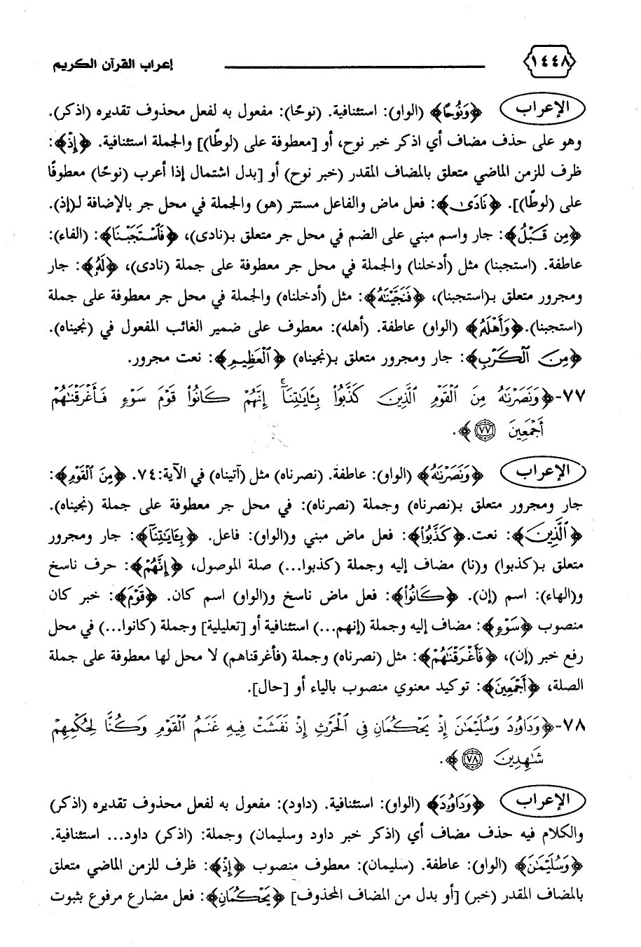 الإعراب {وَداوُدَ} (الواو): استئنافية. (داود): مفعول به لفعل محذوف تقديره (اذكر) والكلام فيه حذف مضاف أي (اذكر خبر داود وسليمان) وجملة: (اذكر) داود ... استئنافية.