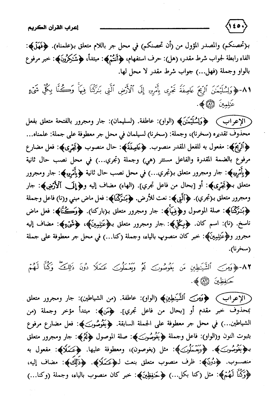 الإعراب {وَلِسُلَيْمانَ} (الواو): عاطفة. (لسليمان): جار ومجرور بالفتحة متعلق بفعل محذوف تقديره (سخرنا)، وجملة: (سخرنا) لسليمان في محل جر معطوفة على جملة: علمناه