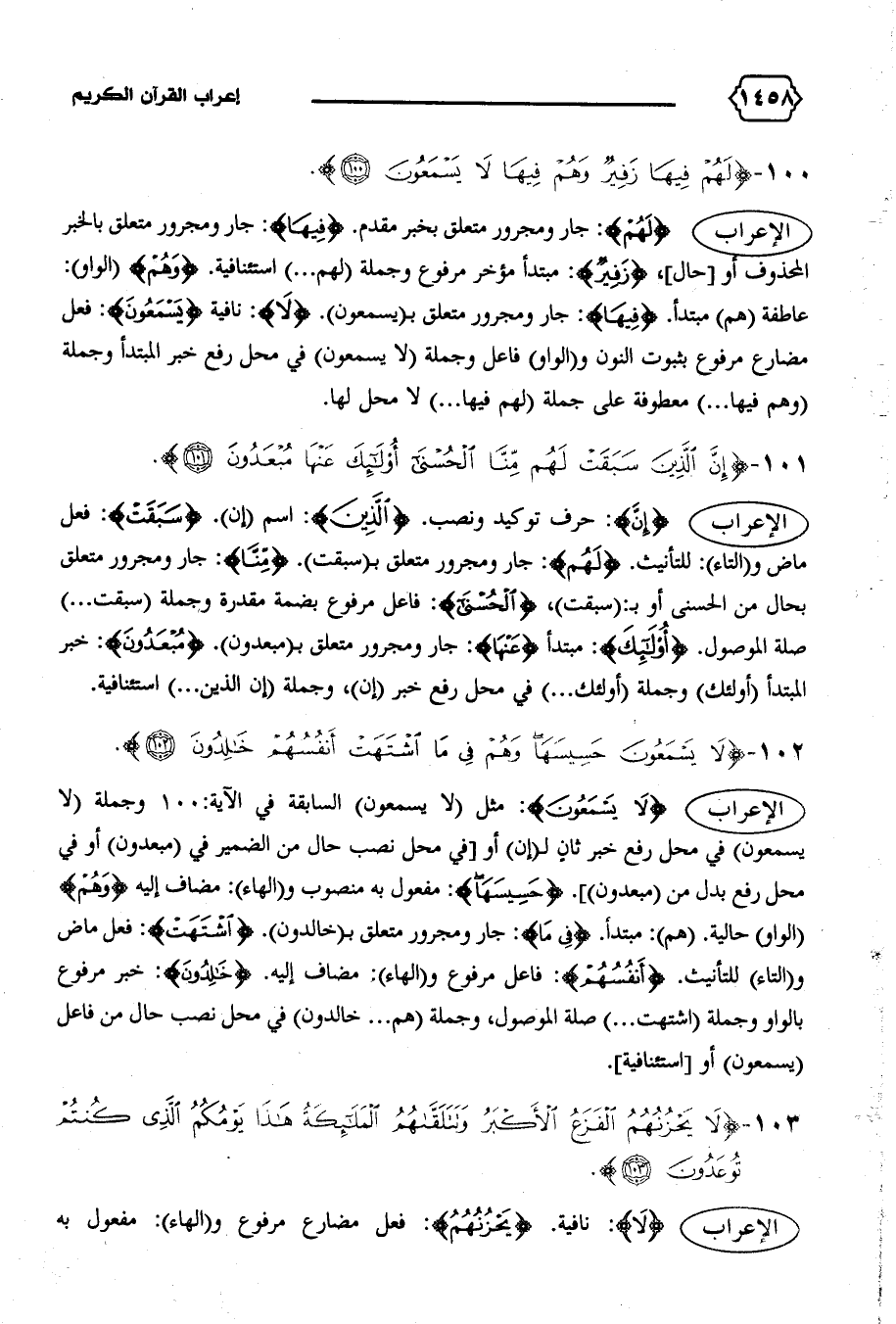 الإعراب {لا يَسْمَعُونَ}: مثل (لا يسمعون) السابقة في الآية: ١٠٠ وجملة (لا يسمعون) في محل رفع خبر ثان ل (إن) أو [في محل نصب حال من الضمير في (مبعدون) أو في محل رفع بدل من (مبعدون)]. {حَسِيسَها}: مفعول به منصوب و (الهاء): مضاف إليه {وَهُمْ} (الواو) حالية. (هم): مبتدأ. {فِي مَا}: جار ومجرور متعلق ب (خالدون). {اِشْتَهَتْ}: فعل ماض و (التاء) للتأنيث. {أَنْفُسُهُمْ}: فاعل مرفوع و (الهاء): مضاف إليه. {خالِدُونَ}: خبر مرفوع بالواو وجملة (اشتهت ... ) صلة الموصول، وجملة (هم ... خالدون) في محل نصب حال من فاعل (يسمعون) أو [استئنافية].