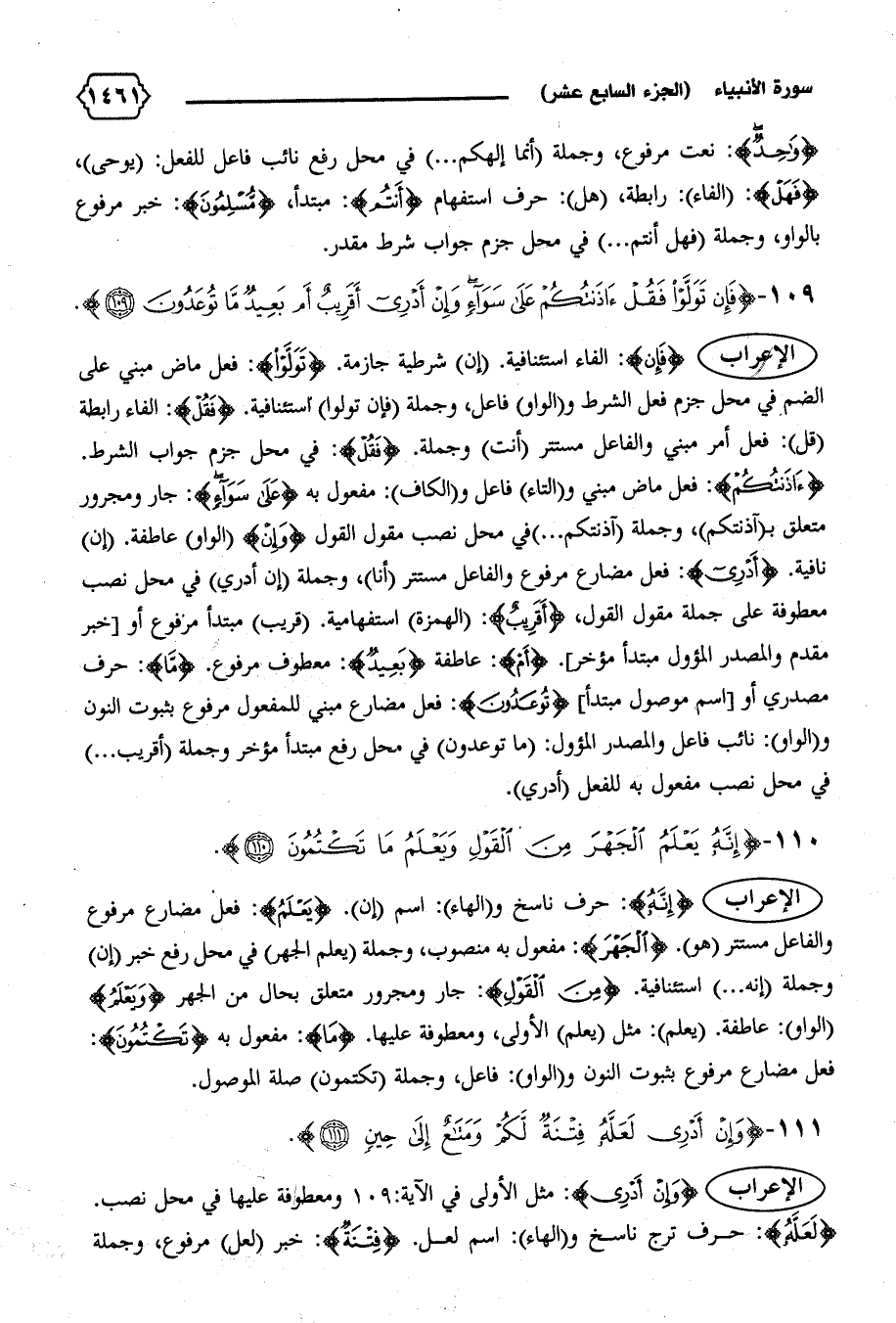 {آذَنْتُكُمْ}: فعل ماض مبني و (التاء) فاعل و (الكاف): مفعول به {عَلى سَواءٍ}: جار ومجرور متعلق ب (آذنتكم)، وجملة (آذنتكم ... ) في محل نصب مقول القول {وَإِنْ} (الواو) عاطفة. (إن) نافية. {أَدْرِي}: فعل مضارع مرفوع والفاعل مستتر (أنا)، وجملة (إن أدري) في محل نصب معطوفة على جملة مقول القول، {أَقَرِيبٌ}: (الهمزة) استفهامية. (قريب) مبتدأ مرفوع أو [خبر مقدم والمصدر المؤول مبتدأ مؤخر]. {أَمْ}: عاطفة {بَعِيدٌ}: معطوف مرفوع. {ما}: حرف مصدري أو [اسم موصول مبتدأ] {تُوعَدُونَ}: فعل مضارع مبني للمفعول مرفوع بثبوت النون و (الواو): نائب فاعل والمصدر المؤول: (ما توعدون) في محل رفع مبتدأ مؤخر وجملة (أقريب ... ) في محل نصب مفعول به للفعل (أدري).