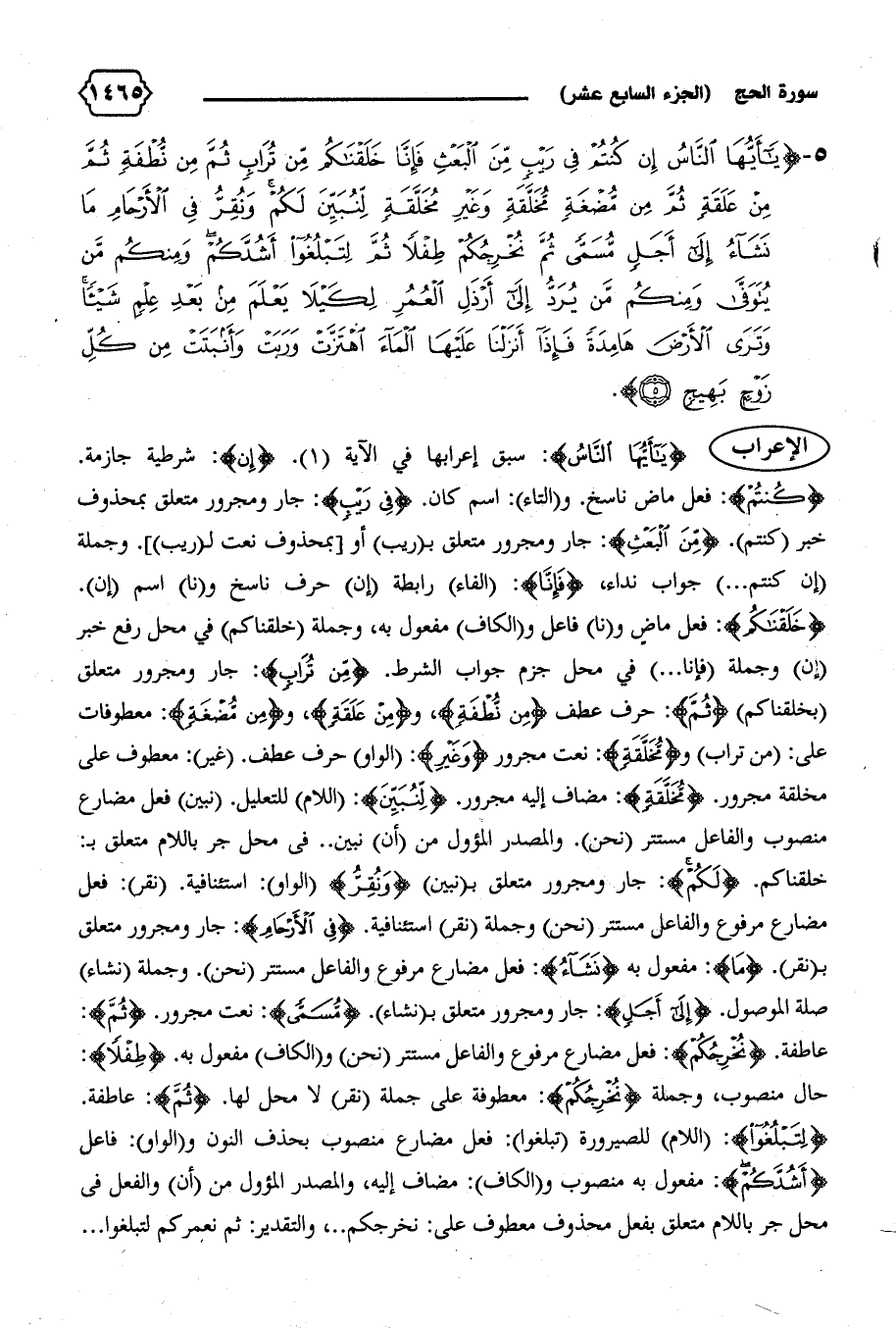 {يا أَيُّهَا النّاسُ إِنْ كُنْتُمْ فِي رَيْبٍ مِنَ الْبَعْثِ فَإِنّا خَلَقْناكُمْ مِنْ تُرابٍ ثُمَّ مِنْ نُطْفَةٍ ثُمَّ مِنْ عَلَقَةٍ ثُمَّ مِنْ مُضْغَةٍ مُخَلَّقَةٍ وَغَيْرِ مُخَلَّقَةٍ لِنُبَيِّنَ لَكُمْ وَنُقِرُّ فِي الْأَرْحامِ ما نَشاءُ إِلى أَجَلٍ مُسَمًّى ثُمَّ نُخْرِجُكُمْ طِفْلاً ثُمَّ لِتَبْلُغُوا أَشُدَّكُمْ وَمِنْكُمْ مَنْ يُتَوَفّى وَمِنْكُمْ مَنْ يُرَدُّ إِلى أَرْذَلِ الْعُمُرِ لِكَيْلا يَعْلَمَ مِنْ بَعْدِ عِلْمٍ شَيْئاً وَتَرَى الْأَرْضَ هامِدَةً فَإِذا أَنْزَلْنا عَلَيْهَا الْماءَ اِهْتَزَّتْ وَرَبَتْ وَأَنْبَتَتْ مِنْ كُلِّ زَوْجٍ بَهِيجٍ (٥)}