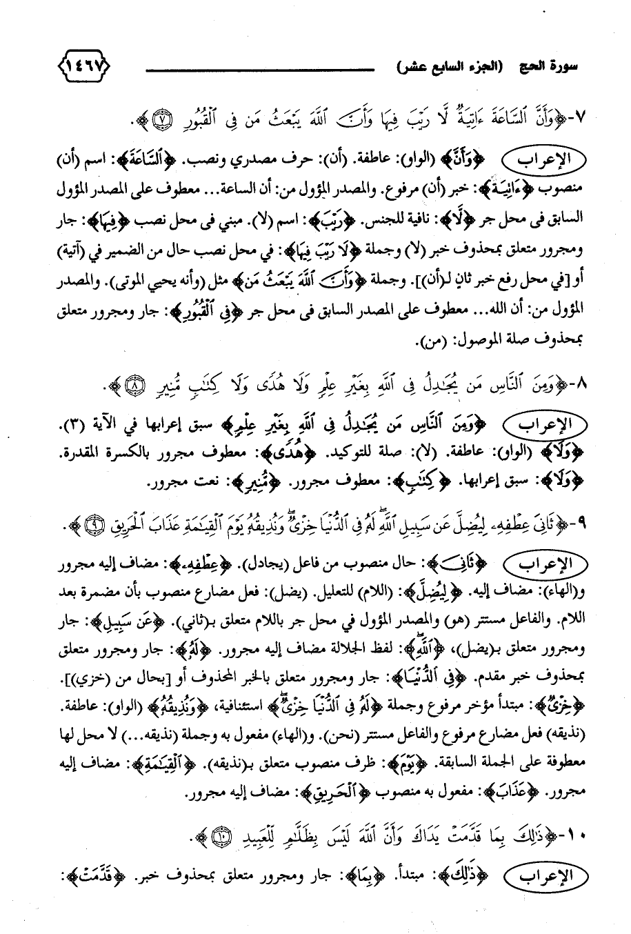 الإعراب {وَأَنَّ} (الواو): عاطفة. (أن): حرف مصدري ونصب. {السّاعَةَ}: اسم (أن) منصوب {آتِيَةٌ}: خبر (أن) مرفوع. والمصدر المؤول من: أن الساعة ... معطوف على المصدر المؤول السابق فى محل جر {لا}: نافية للجنس. {رَيْبَ}: اسم (لا).مبني فى محل نصب {فِيها}: جار ومجرور متعلق بمحذوف خبر (لا) وجملة {لا رَيْبَ فِيها}: في محل نصب حال من الضمير في (آتية) أو [في محل رفع خبر ثان ل (أن)].وجملة {وَأَنَّ اللهَ يَبْعَثُ مَنْ} مثل (وأنه يحيي الموتى).والمصدر المؤول من: أن الله ... معطوف على المصدر السابق فى محل جر {فِي الْقُبُورِ}: جار ومجرور متعلق بمحذوف صلة الموصول: (من).