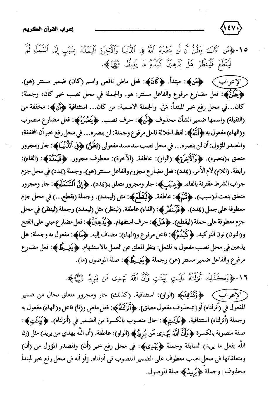 رابطة. (اللام) لام الأمر. (يمدد): فعل مضارع مجزوم والفاعل مستتر (هو).وجملة (يمدد) في محل جزم جواب الشرط مقترنة بالفاء. {بِسَبَبٍ}: جار ومجرور متعلق ب (يمدد). {إِلَى السَّماءِ}: جار ومجرور متعلق بنعت ل (سبب). {ثُمَّ}: عاطفة. {لْيَقْطَعْ}: مثل (ليمدد).وجملة (يقطع ... ) في محل جزم معطوفة على جمل (يمدد). {فَلْيَنْظُرْ}: (الفاء) عاطفة. (لينظر) مثل (ليمدد) وجملة (لينظر) في محل جزم معطوفة على جملة (ليقطع). {هَلْ}: حرف استفهام. {يُذْهِبَنَّ}: فعل مضارع مبني على الفتح و (النون) نون التوكيد. {كَيْدُهُ}: فاعل مرفوع و (الهاء): مضاف إليه. {ما}: مفعول به وجملة: هل يذهبن فى محل نصب مفعول به للفعل: ينظر المعلق عن العمل بالاستفهام. {يَغِيظُ}: فعل مضارع مرفوع والفاعل ضمير مستتر (هو) وجملة {يَغِيظُ}: صلة الموصول (ما).