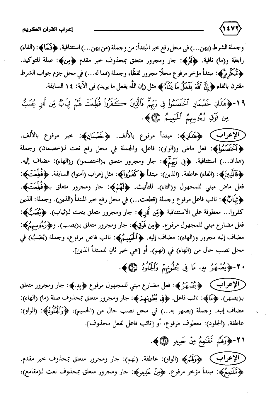 الإعراب {يُصْهَرُ}: فعل مضارع مبني للمجهول مرفوع {بِهِ}: جار ومجرور متعلق ب (يصهر). {ما}: نائب فاعل. {فِي بُطُونِهِمْ}: جار ومجرور متعلق بمحذوف صلة (ما) (الهاء):