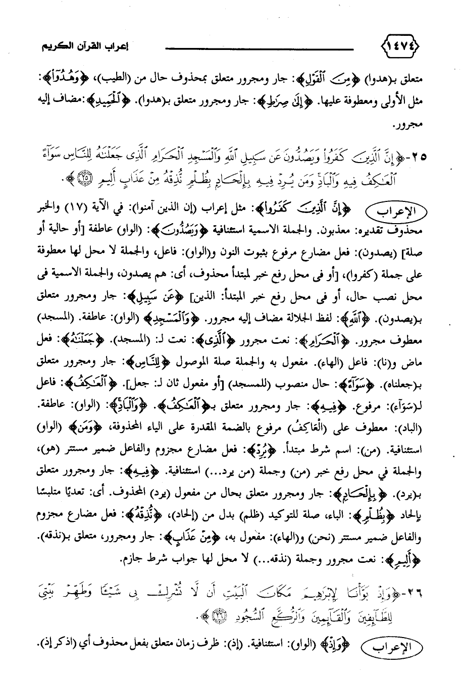 الإعراب {إِنَّ الَّذِينَ كَفَرُوا}: مثل إعراب (إن الذين آمنوا): في الآية (١٧) والخبر محذوف تقديره: معذبون. والجملة الاسمية استئنافية {وَيَصُدُّونَ}: (الواو) عاطفة [أو حالية أو صلة] (يصدون): فعل مضارع مرفوع بثبوت النون و (الواو): فاعل، والجملة لا محل لها معطوفة على جملة (كفروا)، [أو فى محل رفع خبر لمبتدإ محذوف، أى: هم يصدون، والجملة الاسمية فى محل نصب حال، أو فى محل رفع خبر المبتدأ: الذين] {عَنْ سَبِيلِ}: جار ومجرور متعلق ب (يصدون). {اللهِ}: لفظ الجلالة مضاف إليه مجرور. {وَالْمَسْجِدِ} (الواو): عاطفة. (المسجد) معطوف مجرور. {الْحَرامِ}: نعت مجرور {الَّذِي}: نعت ل: (المسجد). {جَعَلْناهُ}: فعل ماض و (نا): فاعل (الهاء).مفعول به والجملة صلة الموصول {لِلنّاسِ}: جار ومجرور متعلق ب (جعلناه). {سَواءً}: حال منصوب (للمسجد) [أو مفعول ثان ل: جعل]. {الْعاكِفُ}: فاعل ل (سواء:) مرفوع. {فِيهِ}: جار ومجرور متعلق ب {الْعاكِفُ}. {وَالْبادِ}: (الواو): عاطفة.
