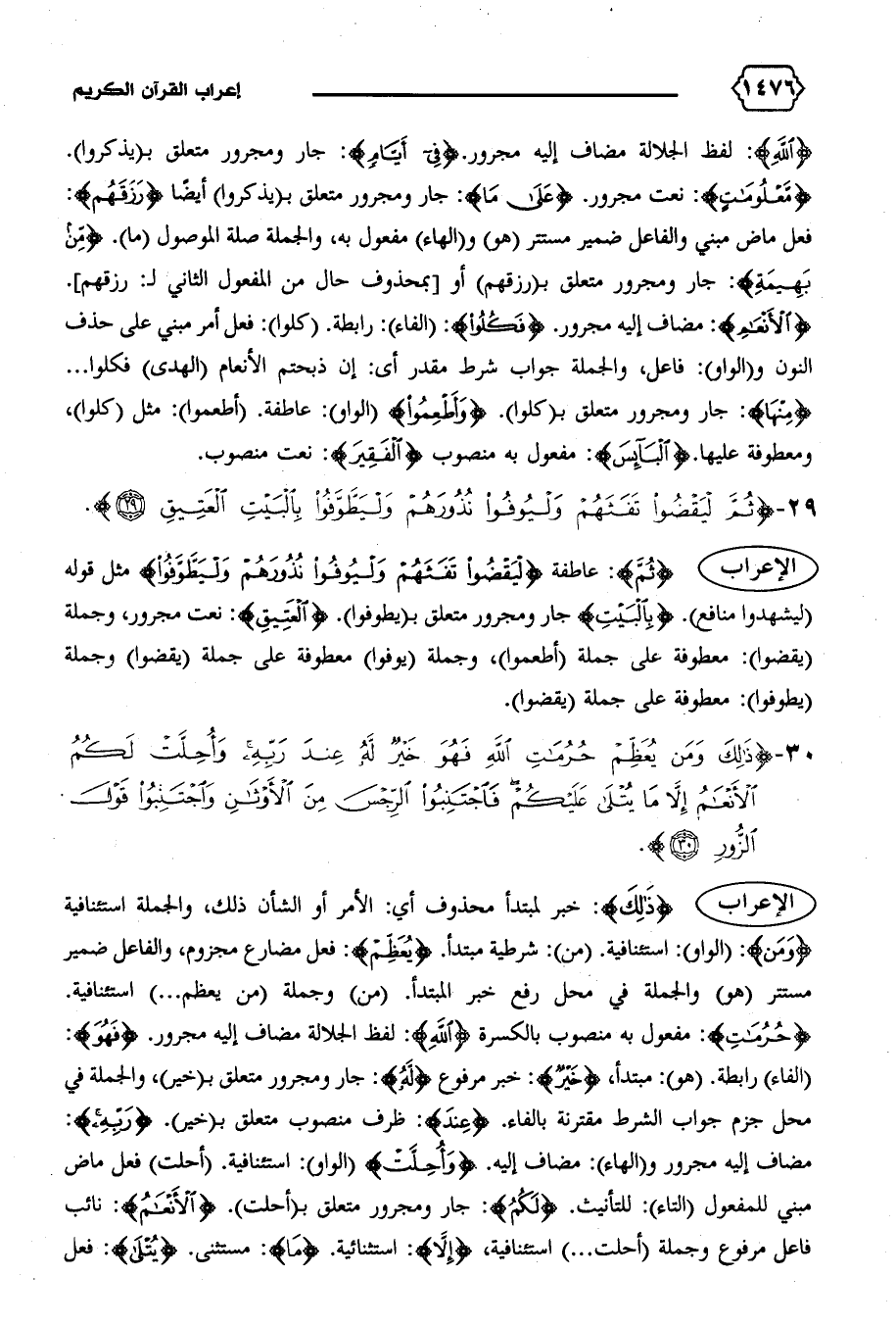 الإعراب {ثُمَّ}: عاطفة {لْيَقْضُوا تَفَثَهُمْ وَلْيُوفُوا نُذُورَهُمْ وَلْيَطَّوَّفُوا}: مثل قوله (ليشهدوا منافع). {بِالْبَيْتِ} جار ومجرور متعلق ب (يطوفوا). {الْعَتِيقِ}: نعت مجرور، وجملة (يقضوا): معطوفة على جملة (أطعموا)، وجملة (يوفوا) معطوفة على جملة (يقضوا) وجملة (يطوفوا): معطوفة على جملة (يقضوا).