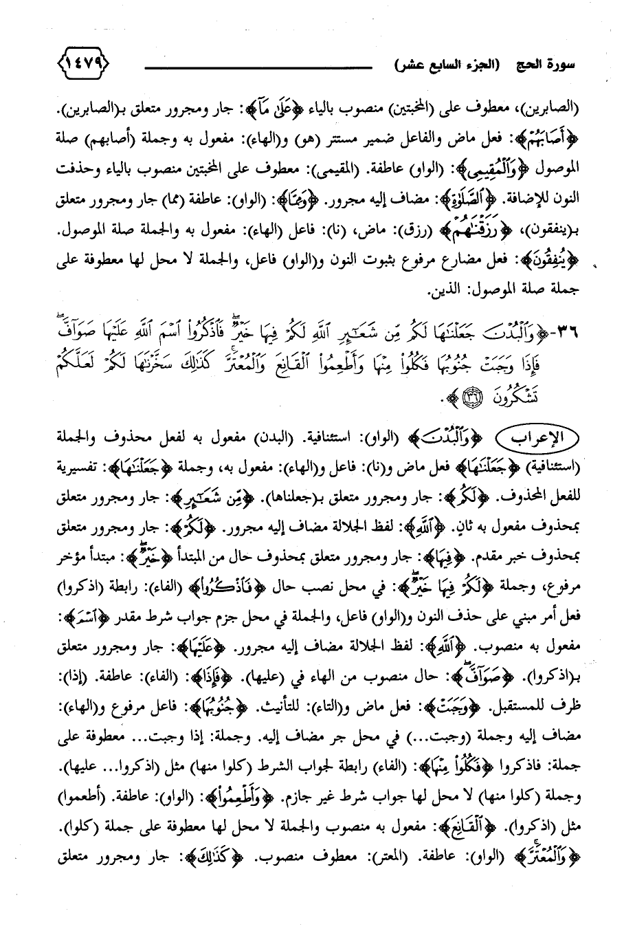 الإعراب {وَالْبُدْنَ} (الواو): استئنافية. (البدن) مفعول به لفعل محذوف والجملة (استئنافية) {جَعَلْناها} فعل ماض و (نا): فاعل و (الهاء): مفعول به، وجملة {جَعَلْناها}: تفسيرية للفعل المحذوف. {لَكُمْ}: جار ومجرور متعلق ب (جعلناها). {مِنْ شَعائِرِ}: جار ومجرور متعلق بمحذوف مفعول به ثان. {اللهِ}: لفظ الجلالة مضاف إليه مجرور. {لَكُمْ}: جار ومجرور متعلق بمحذوف خبر مقدم. {فِيها}: جار ومجرور متعلق بمحذوف حال من المبتدأ {خَيْرٌ}: مبتدأ مؤخر مرفوع، وجملة {لَكُمْ فِيها خَيْرٌ}: في محل نصب حال {فَاذْكُرُوا} (الفاء): رابطة (اذكروا) فعل أمر مبني على حذف النون و (الواو) فاعل، والجملة في محل جزم جواب شرط مقدر {اِسْمَ}: