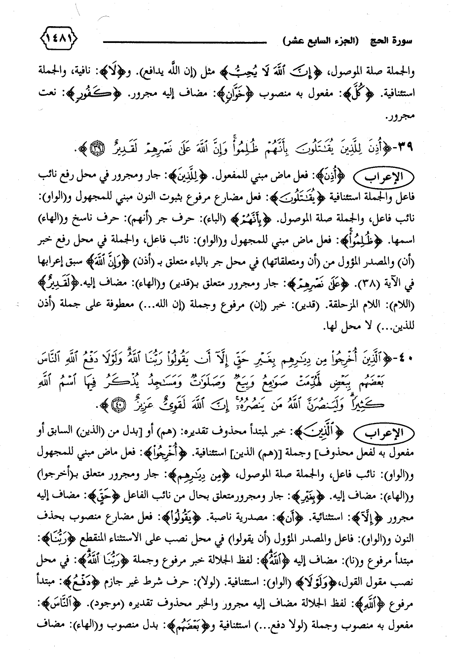 الإعراب {الَّذِينَ}: خبر لمبتدإ محذوف تقديره: (هم) أو [بدل من (الذين) السابق أو مفعول به لفعل محذوف] وجملة [(هم) الذين] استئنافية. {أُخْرِجُوا}: فعل ماض مبني للمجهول و (الواو): نائب فاعل، والجملة صلة الموصول، {مِنْ دِيارِهِمْ}: جار ومجرور متعلق ب (أخرجوا) و (الهاء): مضاف إليه. {بِغَيْرِ}: جار ومجرور متعلق بحال من نائب الفاعل {حَقٍّ}: مضاف إليه مجرور {إِلاّ}: استثنائية. {أَنْ}: مصدرية ناصبة. {يَقُولُوا}: فعل مضارع منصوب بحذف النون و (الواو): فاعل والمصدر المؤول (أن يقولوا) في محل نصب على الاستثناء المنقطع {رَبُّنَا}: