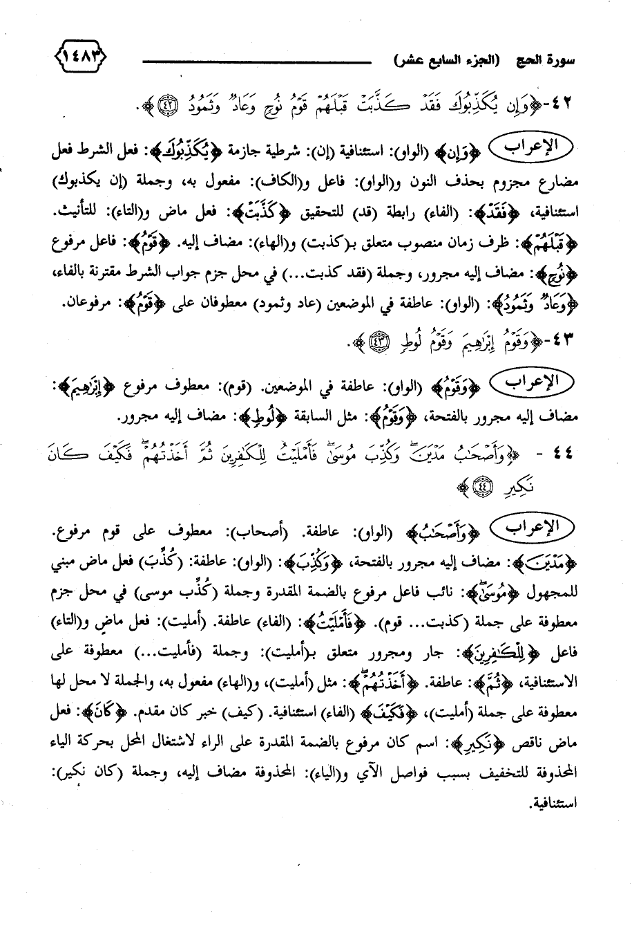 {مَدْيَنَ}: مضاف إليه مجرور بالفتحة، {وَكُذِّبَ}: (الواو): عاطفة: (كذّب) فعل ماض مبني للمجهول {مُوسى}: نائب فاعل مرفوع بالضمة المقدرة وجملة (كذّب موسى) في محل جزم معطوفة على جملة (كذبت ... قوم). {فَأَمْلَيْتُ}: (الفاء) عاطفة. (أمليت): فعل ماض و (التاء) فاعل {لِلْكافِرِينَ}: جار ومجرور متعلق ب (أمليت): وجملة (فأمليت ... ) معطوفة على الاستئنافية، {ثُمَّ}: عاطفة. {أَخَذْتُهُمْ}: مثل (أمليت)، و (الهاء) مفعول به، والجملة لا محل لها معطوفة على جملة (أمليت)، {فَكَيْفَ} (الفاء) استئنافية. (كيف) خبر كان مقدم. {كانَ}: فعل ماض ناقص {نَكِيرِ}: اسم كان مرفوع بالضمة المقدرة على الراء لاشتغال المحل بحركة الياء المحذوفة للتخفيف بسبب فواصل الآي و (الياء): المحذوفة مضاف إليه، وجملة (كان نكير):