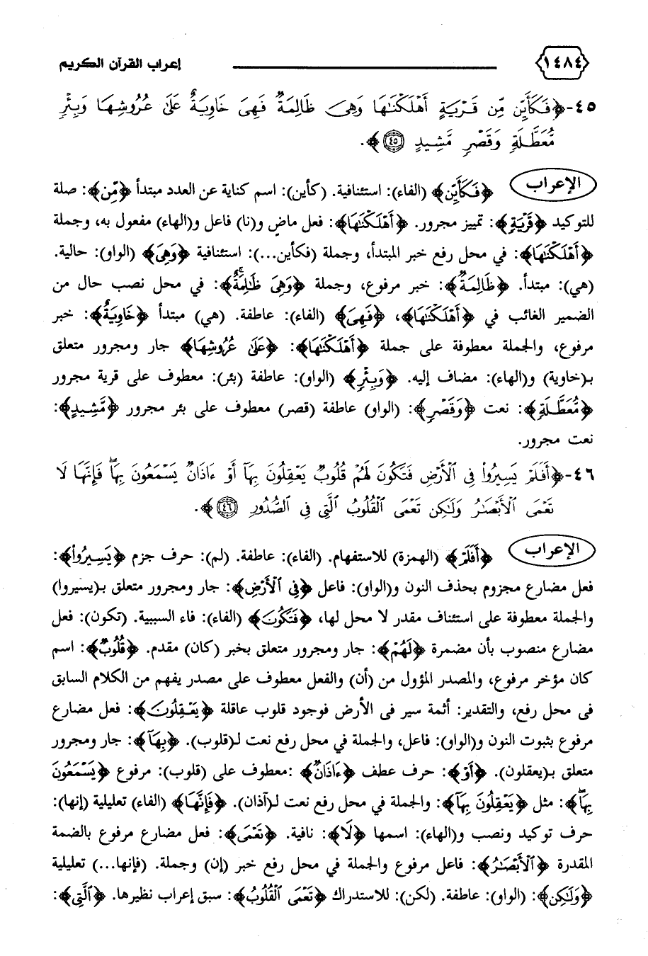 (هي): مبتدأ. {ظالِمَةٌ}: خبر مرفوع، وجملة {وَهِيَ ظالِمَةٌ}: في محل نصب حال من الضمير الغائب في {أَهْلَكْناها،} {فَهِيَ} (الفاء): عاطفة. (هي) مبتدأ {خاوِيَةٌ}: خبر مرفوع، والجملة معطوفة على جملة {أَهْلَكْناها}: {عَلى عُرُوشِها} جار ومجرور متعلق ب (خاوية) و (الهاء): مضاف إليه. {وَبِئْرٍ} (الواو): عاطفة (بئر): معطوف على قرية مجرور {مُعَطَّلَةٍ}: نعت {وَقَصْرٍ}: (الواو) عاطفة (قصر) معطوف على بئر مجرور {مَشِيدٍ}: