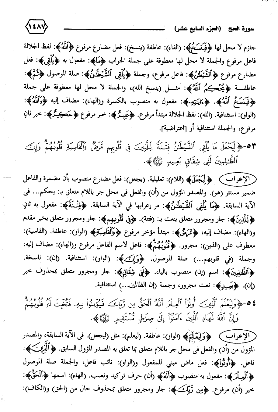 الإعراب {لِيَجْعَلَ} (اللام): تعليلية. (يجعل): فعل مضارع منصوب بأن مضمرة والفاعل ضمير مستتر (هو).والمصدر المؤول من (أن) والفعل فى محل جر باللام متعلق ب: يحكم ... فى الآية السابقة. {ما يُلْقِي الشَّيْطانُ}: مر إعرابها في الآية السابقة. {فِتْنَةً}: مفعول به ثان {لِلَّذِينَ}: جار ومجرور متعلق بنعت ب: (فتنة). {فِي قُلُوبِهِمْ}: جار ومجرور متعلق بخبر مقدم و (الهاء): مضاف إليه، {مَرَضٌ}: مبتدأ مؤخر مرفوع {وَالْقاسِيَةِ} (الواو): عاطفة. (القاسية):