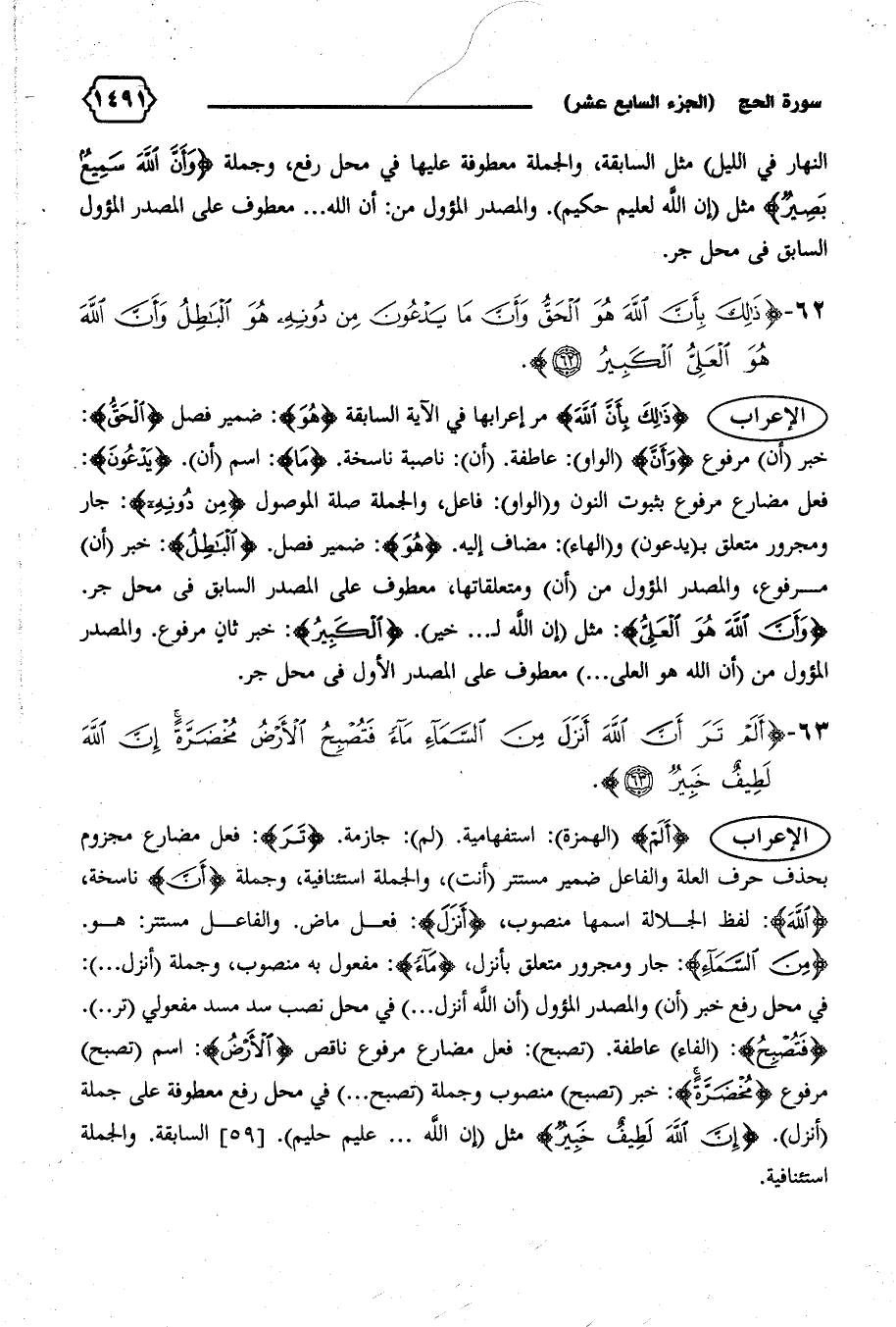 {فَتُصْبِحُ}: (الفاء) عاطفة. (تصبح): فعل مضارع مرفوع ناقص {الْأَرْضُ}: اسم (تصبح) مرفوع {مُخْضَرَّةً}: خبر (تصبح) منصوب وجملة (تصبح ... ) في محل رفع معطوفة على جملة (أنزل). {إِنَّ اللهَ لَطِيفٌ خَبِيرٌ} مثل (إن الله ... عليم حليم). [٥٩] السابقة. والجملة استئنافية.