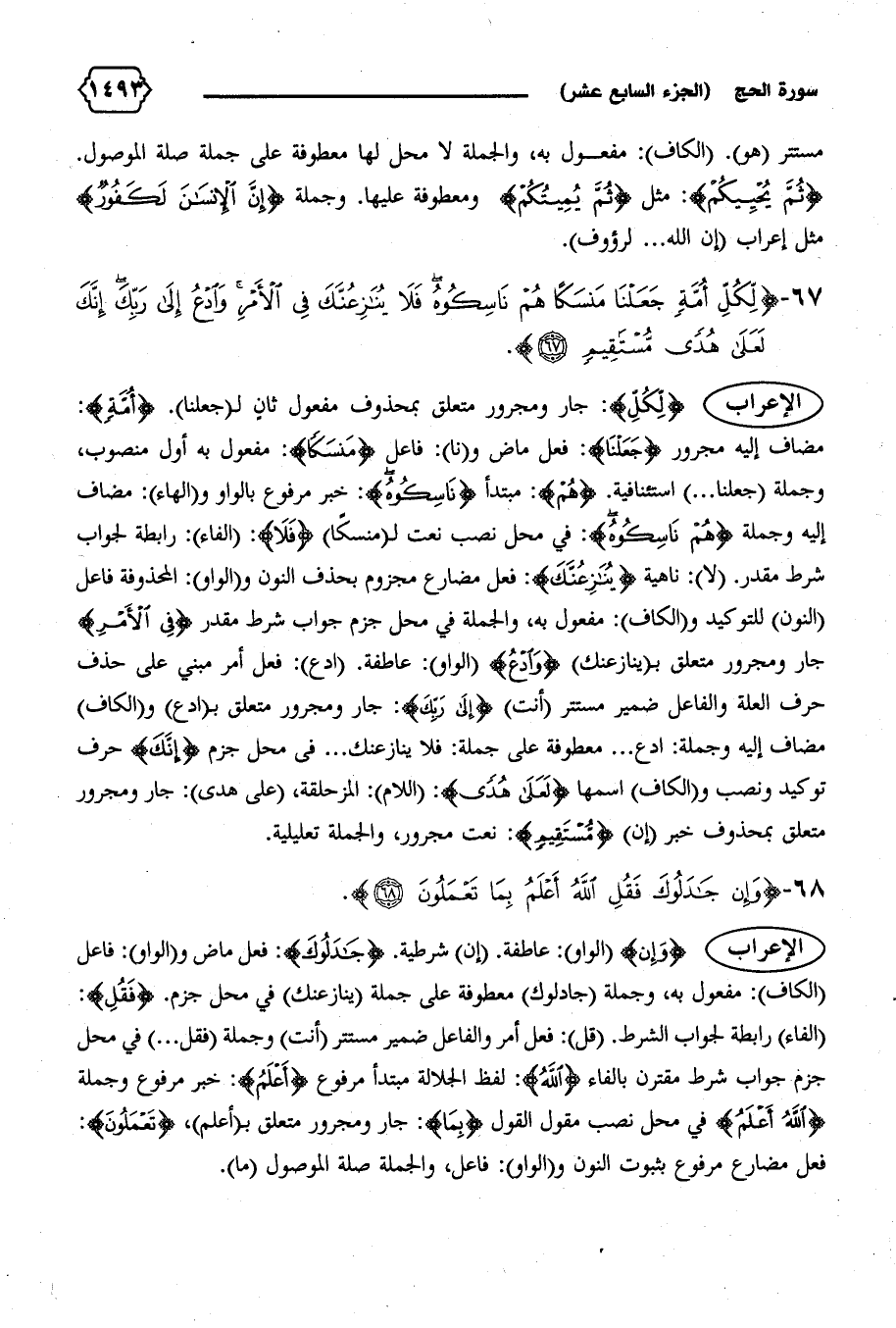 مضاف إليه مجرور {جَعَلْنا}: فعل ماض و (نا): فاعل {مَنْسَكاً}: مفعول به أول منصوب، وجملة (جعلنا ... ) استئنافية. {هُمْ}: مبتدأ {ناسِكُوهُ}: خبر مرفوع بالواو و (الهاء): مضاف إليه وجملة {هُمْ ناسِكُوهُ}: في محل نصب نعت ل (منسكا) {فَلا}: (الفاء): رابطة لجواب شرط مقدر. (لا): ناهية {يُنازِعُنَّكَ}: فعل مضارع مجزوم بحذف النون و (الواو): المحذوفة فاعل (النون) للتوكيد و (الكاف): مفعول به، والجملة في محل جزم جواب شرط مقدر {فِي الْأَمْرِ}: