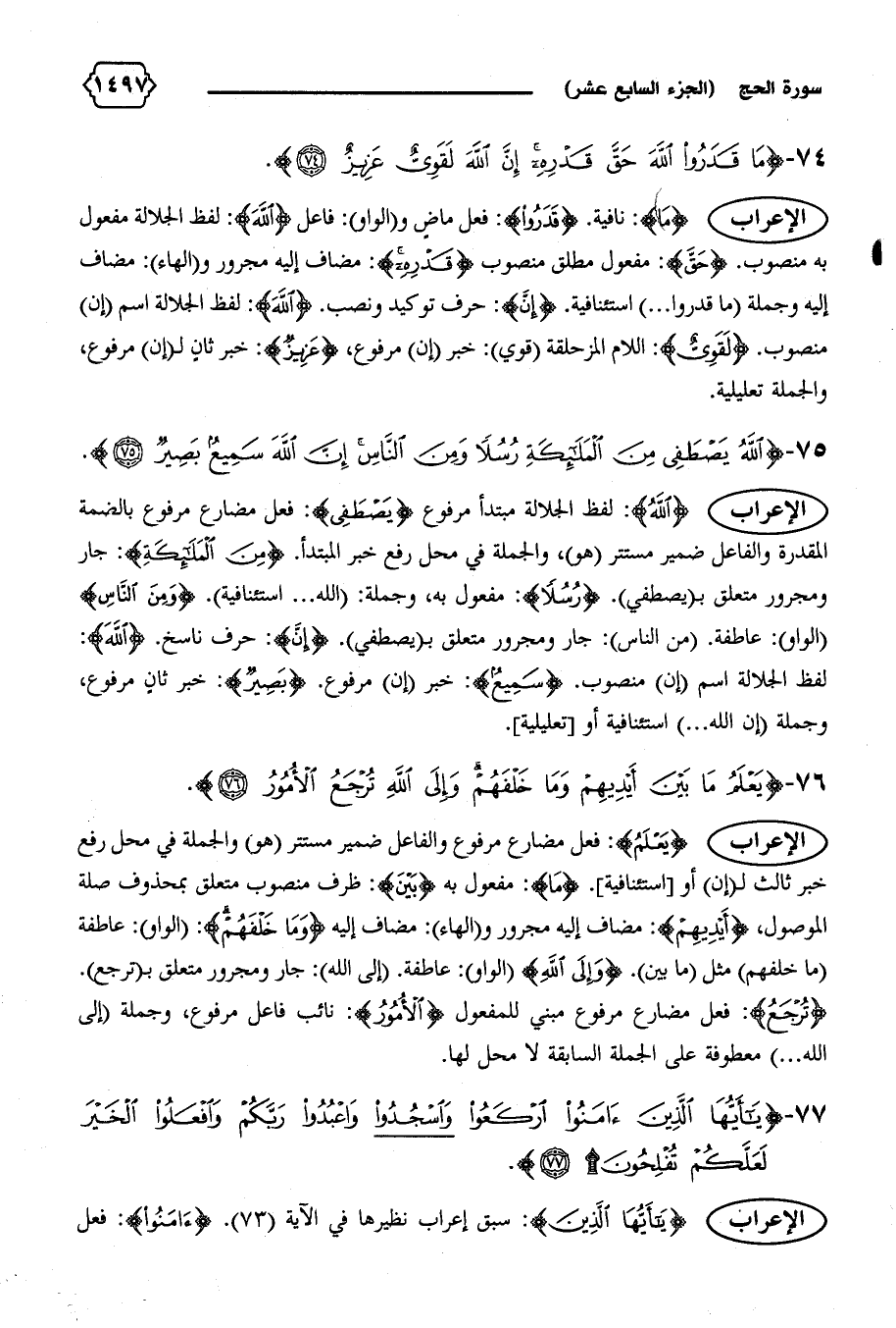 الإعراب {اللهُ}: لفظ الجلالة مبتدأ مرفوع {يَصْطَفِي}: فعل مضارع مرفوع بالضمة المقدرة والفاعل ضمير مستتر (هو)، والجملة في محل رفع خبر المبتدأ. {مِنَ الْمَلائِكَةِ}: جار ومجرور متعلق ب (يصطفي). {رُسُلاً}: مفعول به، وجملة: (الله ... استئنافية). {وَمِنَ النّاسِ} (الواو): عاطفة. (من الناس): جار ومجرور متعلق ب (يصطفي). {إِنَّ}: حرف ناسخ. {اللهُ}: