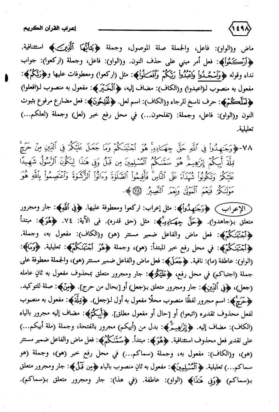 {حَرَجٍ}: اسم مجرور لفظا منصوب محلا مفعول به أول ل (جعل). {مِلَّةَ}: مفعول به منصوب لفعل محذوف تقديره (اتبعوا) أو [حال أو مفعول مطلق]. {أَبِيكُمْ}: مضاف إليه مجرور بالياء (الكاف): مضاف إليه. {إِبْراهِيمَ}: بدل من (أبيكم) مجرور بالفتحة، وجملة (ملة أبيكم ... ) على تقدير فعل محذوف استئنافية. {هُوَ}: مبتدأ. {سَمّاكُمُ}: فعل ماض والفاعل ضمير مستتر (هو)، و (الكاف): مفعول به، وجملة (سماكم ... ) في محل رفع خبر (هو)، وجملة (هو سماكم ... ) تعليلية. {الْمُسْلِمِينَ}: مفعول به ثان منصوب بالياء {مِنْ قَبْلُ}: جار ومجرور متعلق ب (سماكم) {وَفِي هذا} (الواو): عاطفة. (في هذا): جار ومجرور متعلق ب (سماكم).