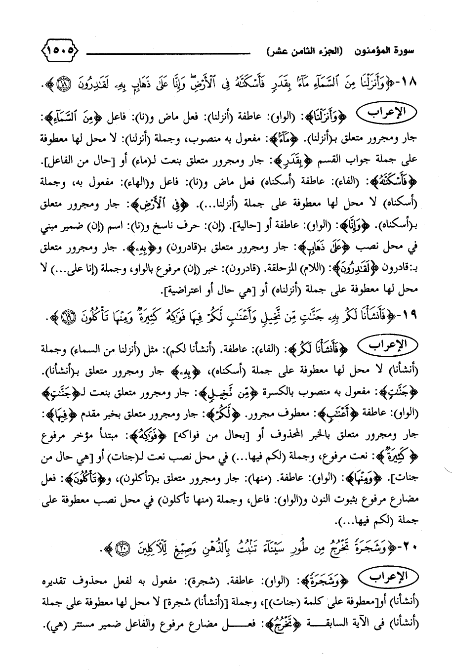 الإعراب {فَأَنْشَأْنا لَكُمْ}: (الفاء): عاطفة. (أنشأنا لكم): مثل (أنزلنا من السماء) وجملة (أنشأنا) لا محل لها معطوفة على جملة (أسكناه)، {بِهِ} جار ومجرور متعلق ب (أنشأنا).