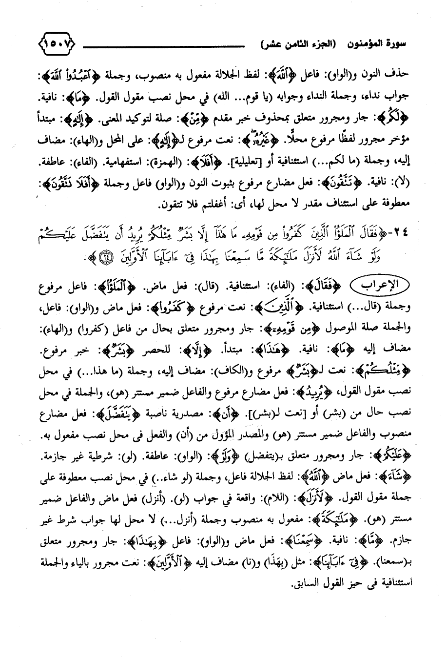 الإعراب {فَقالَ}: (الفاء): استئنافية. (قال): فعل ماض. {الْمَلَأُ}: فاعل مرفوع وجملة (قال ... ) استئنافية. {الَّذِينَ}: نعت مرفوع {كَفَرُوا}: فعل ماض و (الواو): فاعل، والجملة صلة الموصول {مِنْ قَوْمِهِ}: جار ومجرور متعلق بحال من فاعل (كفروا) و (الهاء):
